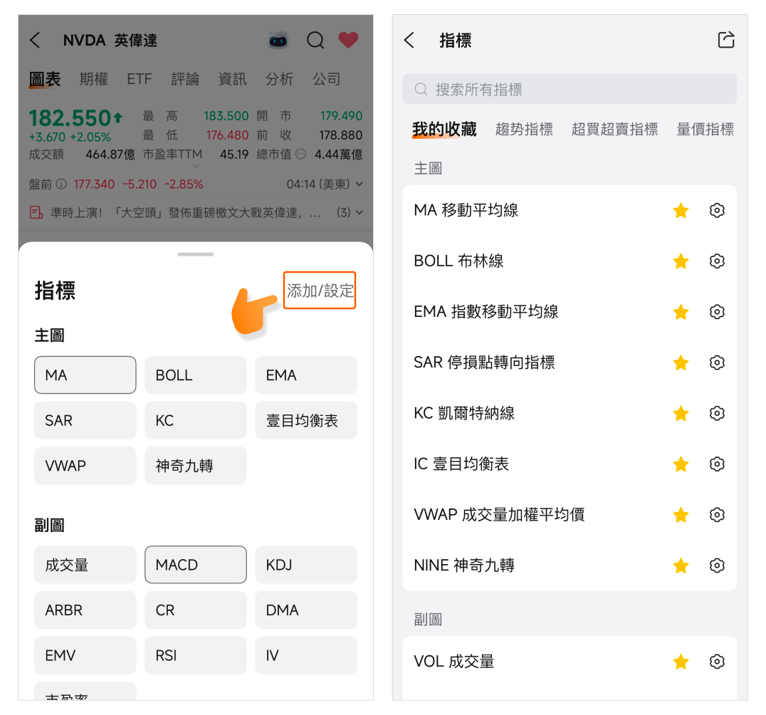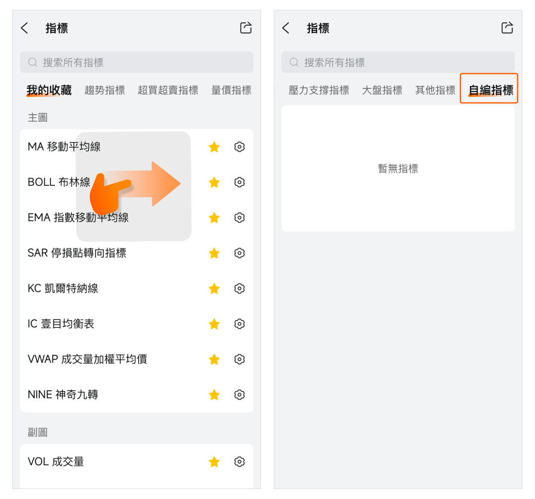 前面为主图指标,即显示在K线图上的指标;后面为副图指标,即单独显示在K线图下方的指标,均支持同时展示多个。您可以左右滑动来挑选您需要的指标,点亮为橙色字体则指标显现,点灭为灰色字体则指标收起。