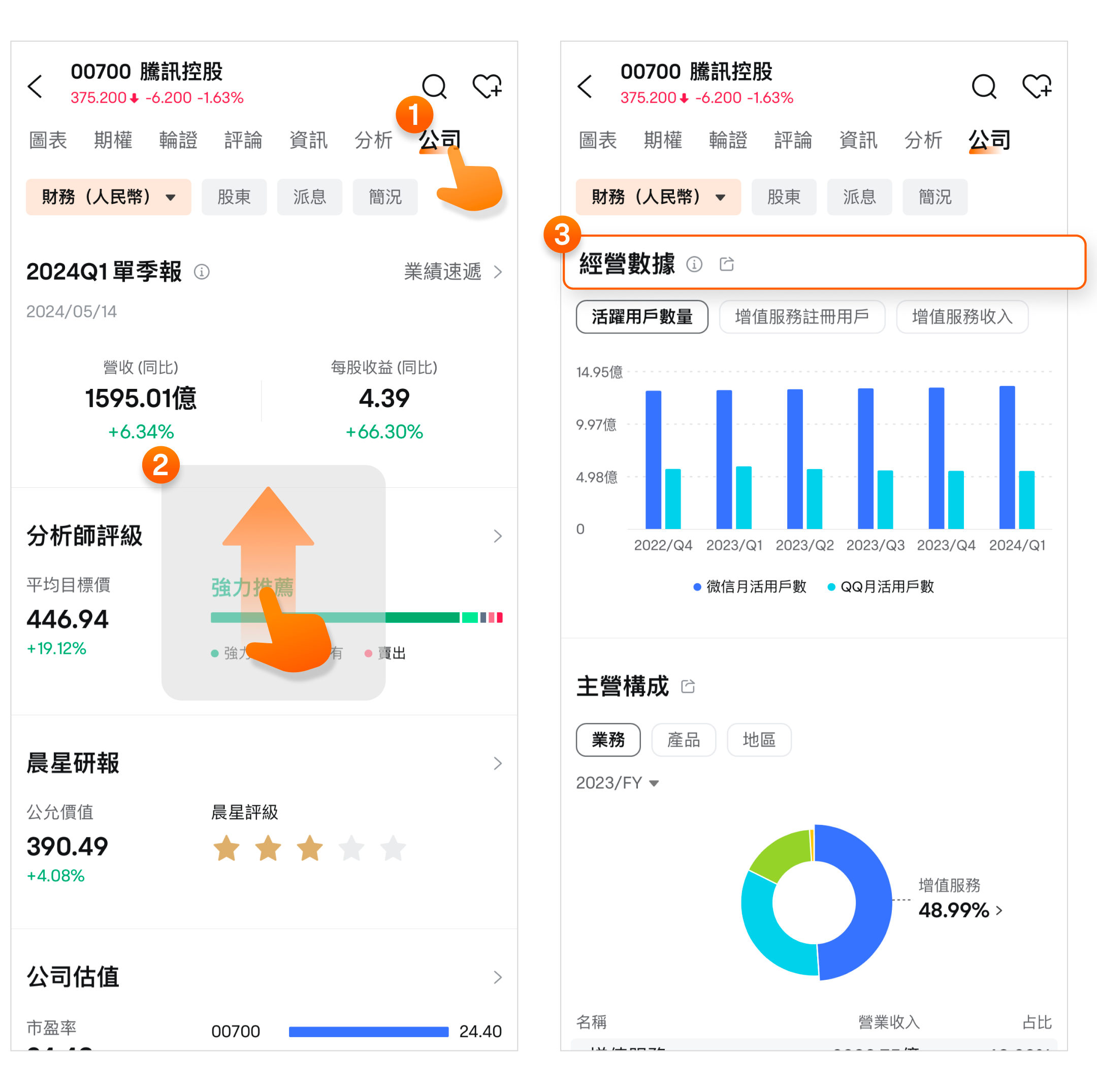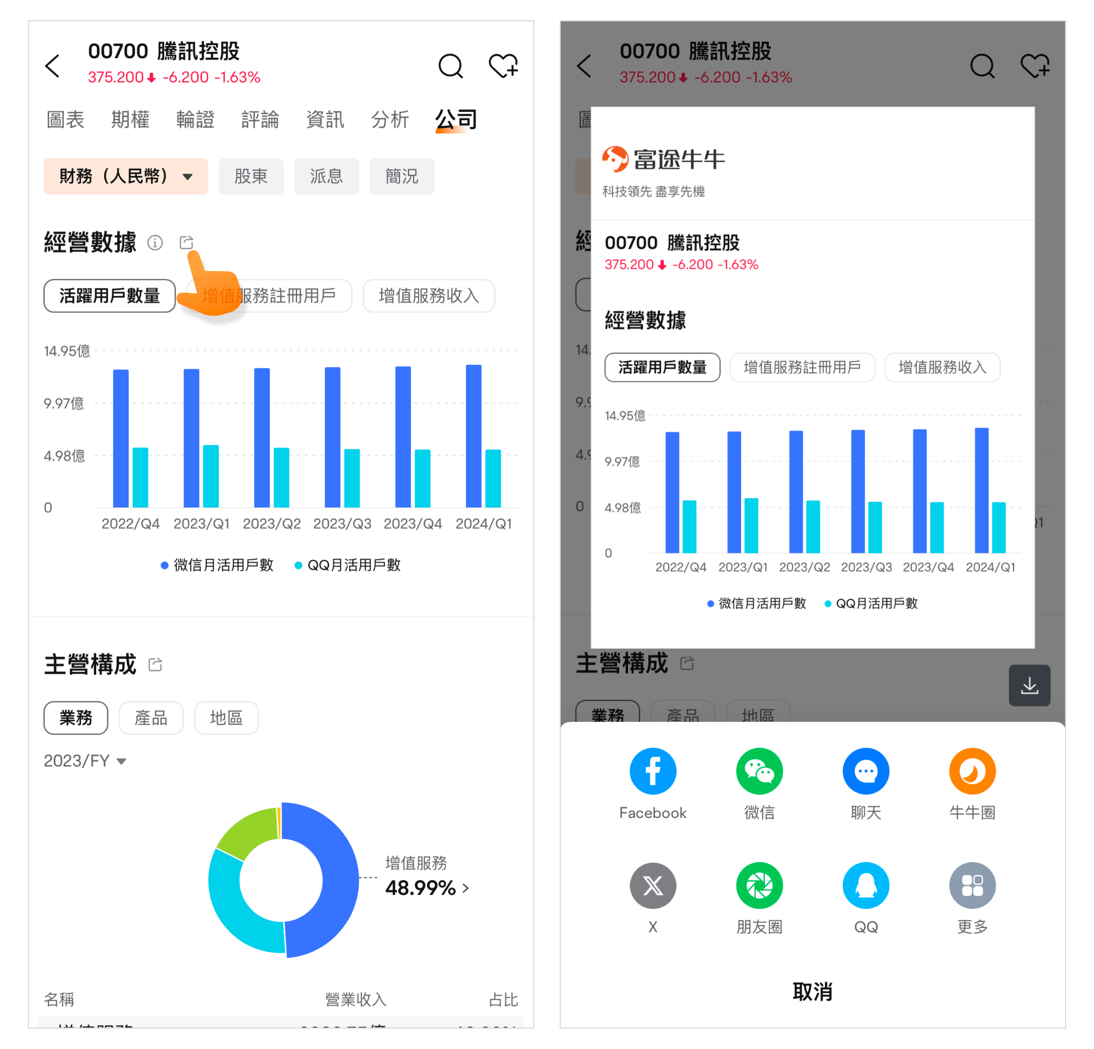 「公司」页面的其中一个子功能是经营数据,该栏目默认展示活跃用户数量、增值服务注册用户、增值服务收入3个可视化呈现的经营数据图表。您可以在此处了解到最近5或7个季度的经营数据情况,清晰地看到公司的用户数据与增值服务收入变化,是在健康发展还是萎缩。