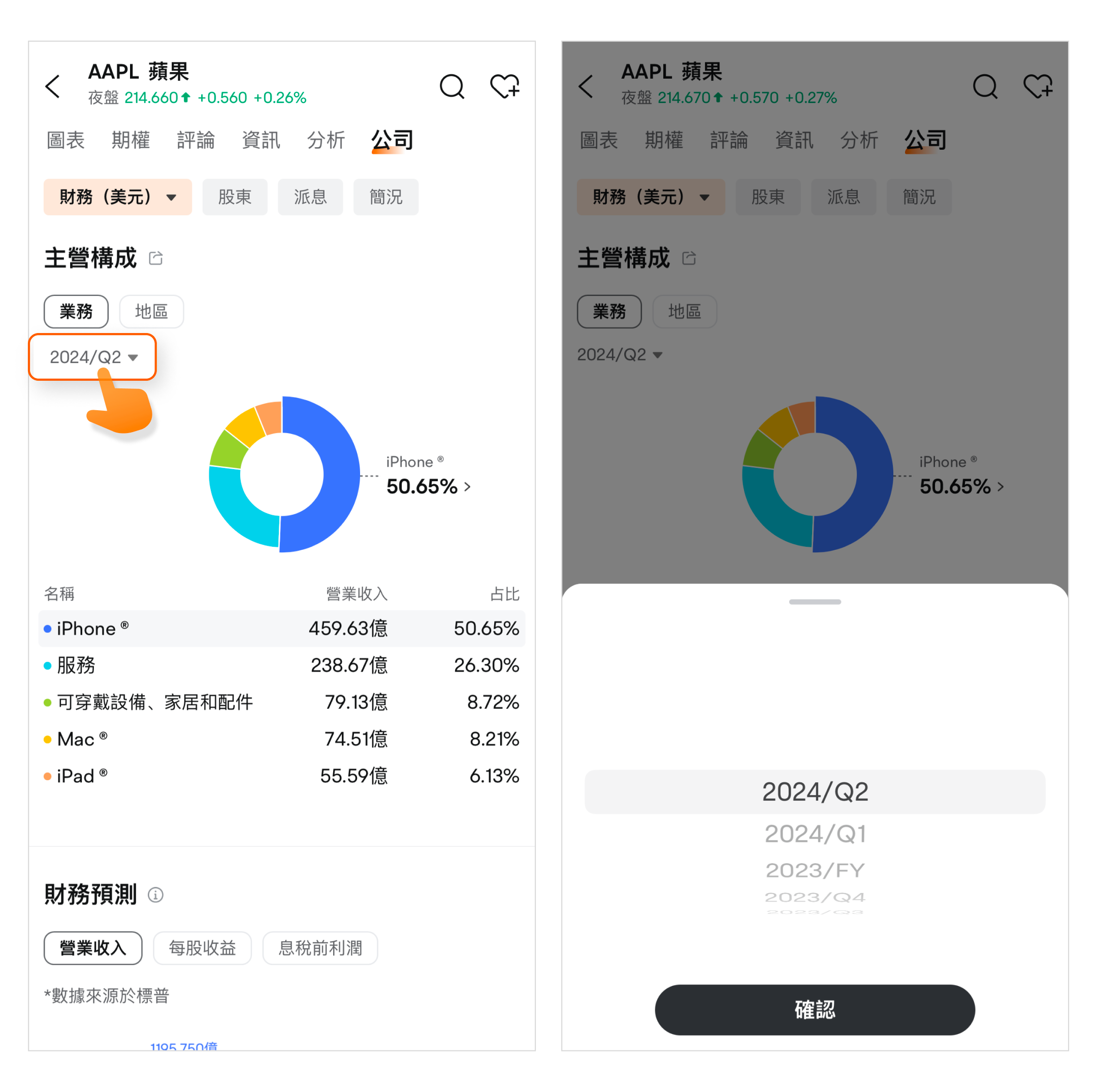 通过点击「2024Q2」下滑标,您可以选择相应年份的时间,如“FY”、“H1”或按季度选择。