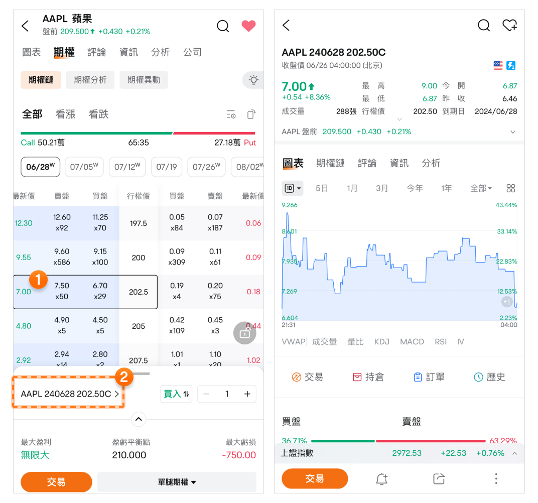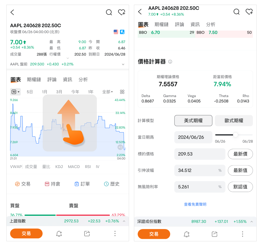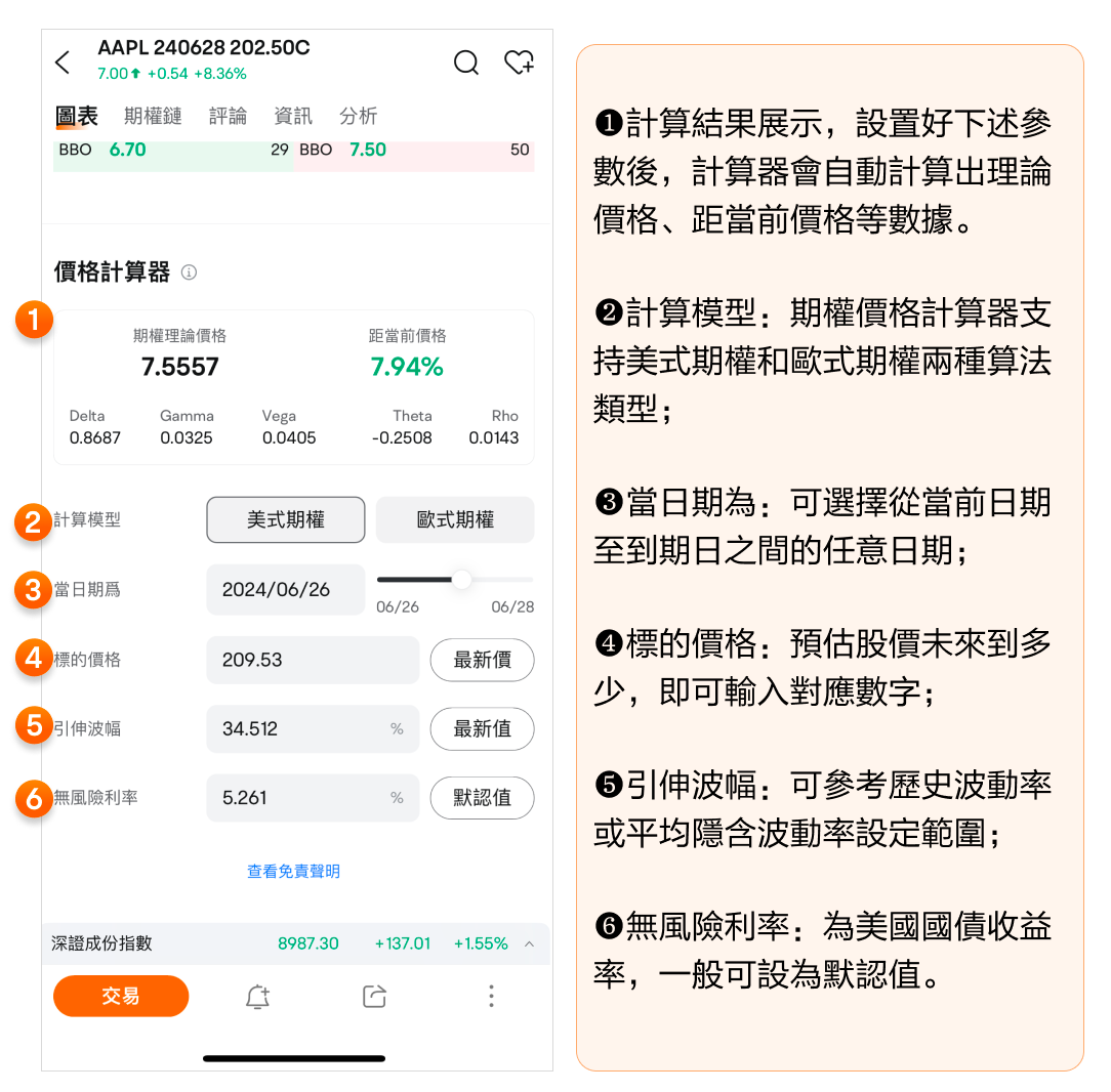 路径:标的个股页>期权>期权链>选择一张期权,点击期权名称进入详情页,下滑至「价格计算器」。
