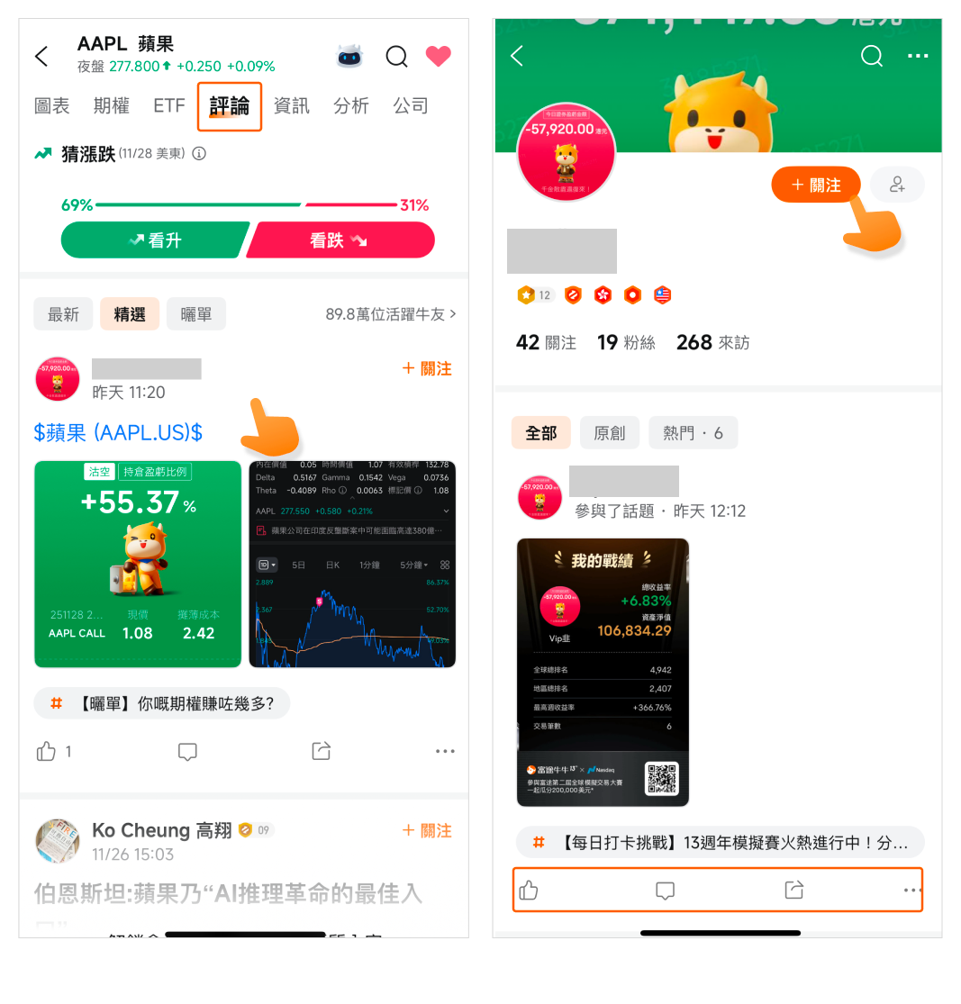 如果你对某位牛友感兴趣,你可以选择点击「关注」关注他的实时看法,一旦发表将对你实时提醒。你也可以点击牛友的头像,进入他的主页,查看他过往发表的帖子内容。