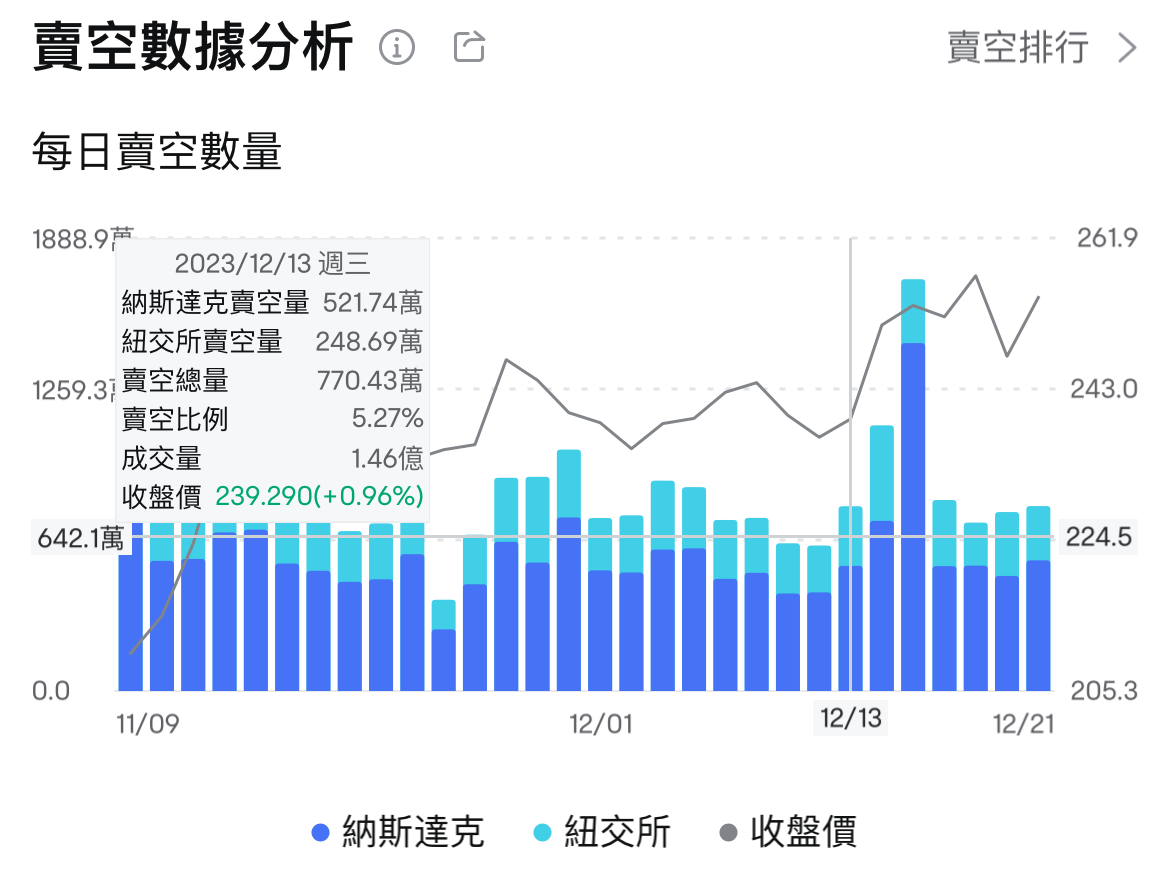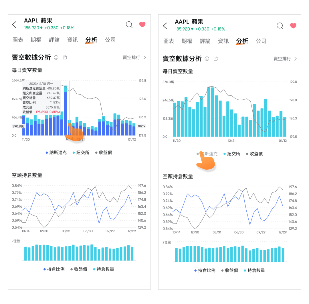路径:个股页>分析>卖空数据分析。这里可以看到卖空数据分为每日卖空数量和空头持仓数量两个部分。