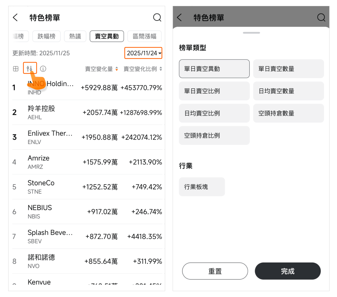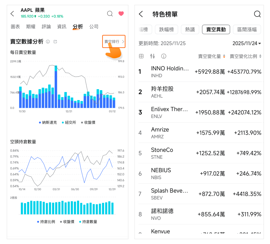 点击卖空「卖空排行」,查看卖空异动榜单,且支持切换多种维度以及不同日期的数据。