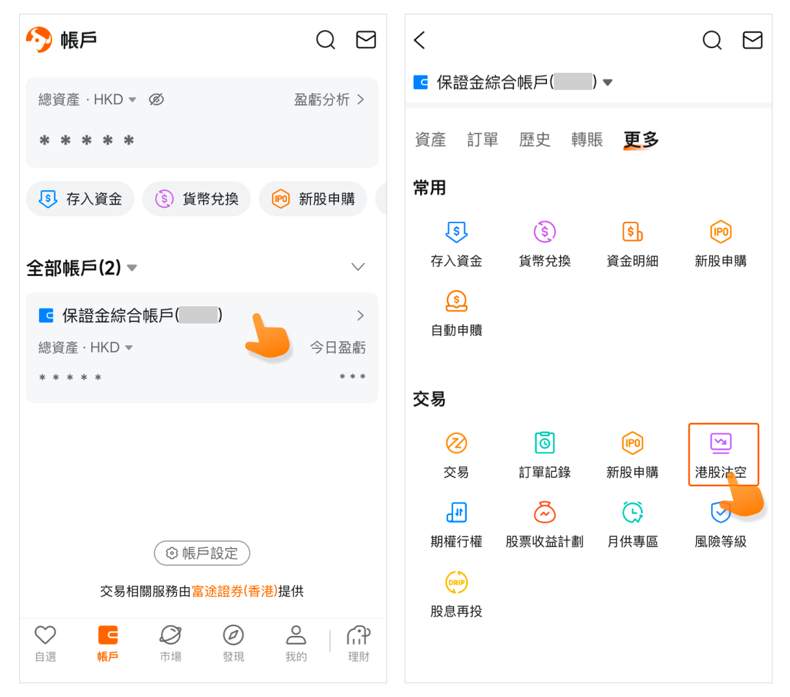 首先需要开通港股融资融券账户;点击综合账户>更多>港股沽空
