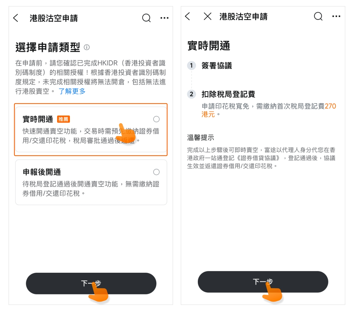 选择申请类型,建议使用【实时开通】。在等待税务局登记过程中,即可进行港股卖空操作,无需等待税务局完成审批。