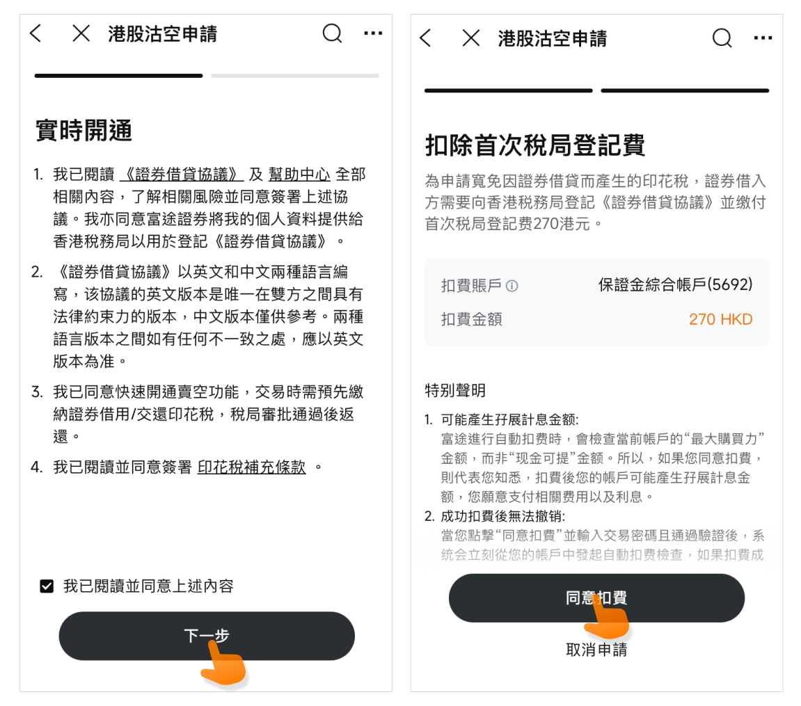 开通港股卖空需要向香港税务局登记《证券借贷协议》并缴付首次税务局登记费270港元。
