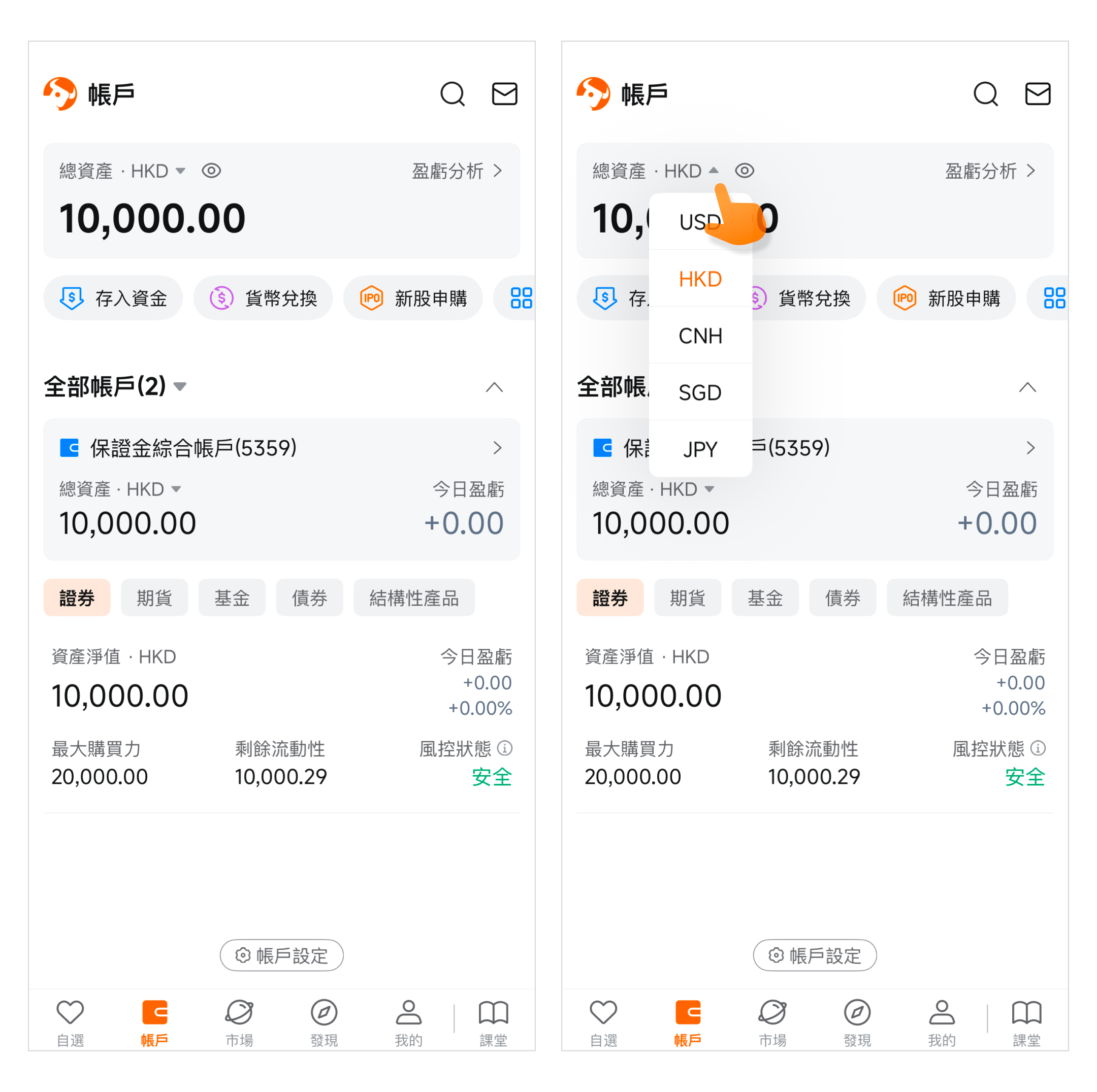通过点击总资产·港元,您可以切换您想展示的币种,如美元、港元、人民币等。