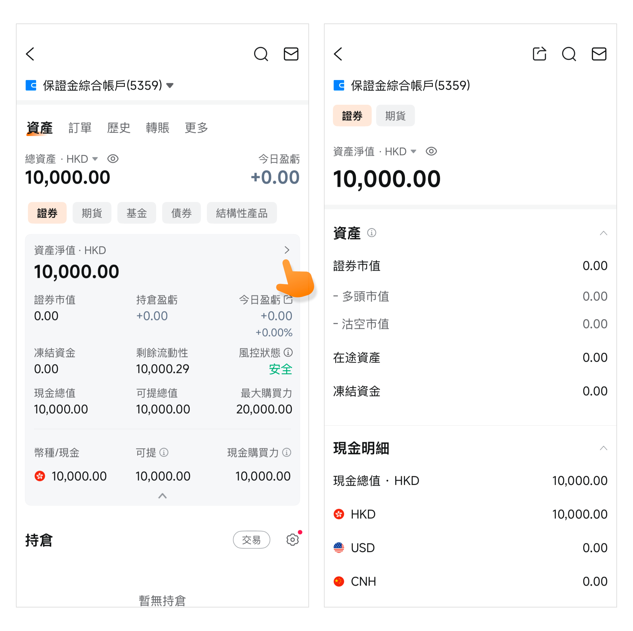 通过点击下图方框中按钮,您还可切换至其他资产,如期货、基金、债券和票据。您可查看具体各币种的现金情况,当现金为负数时,可能会产生融资利息,您可通过存入资金、平仓部分股票或兑换等方式进行还款。