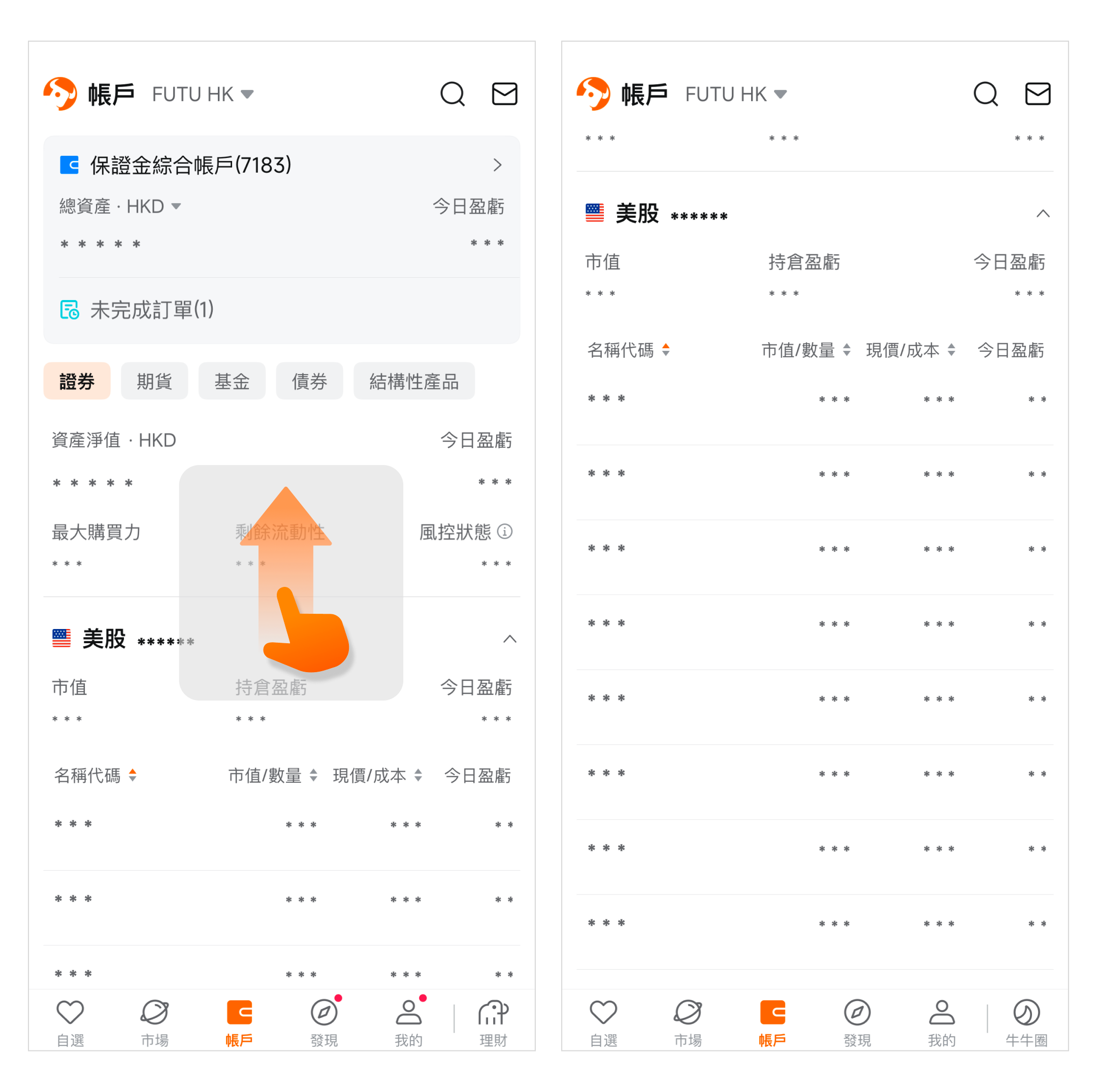 若您持有股票,在账户页首页下滑,您可查看当前的持仓情况。更多具体功能请点击