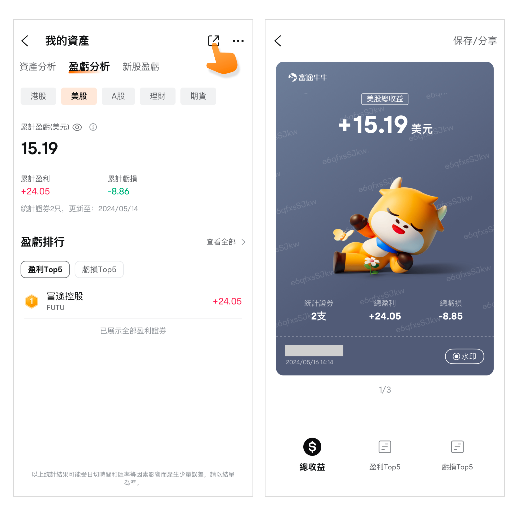 通过点击右上方的【分享】,您可以获得总资产、盈利Top5、亏损Top5的可视化图片,通过左右滑动您可以选择不同的子功能图片。