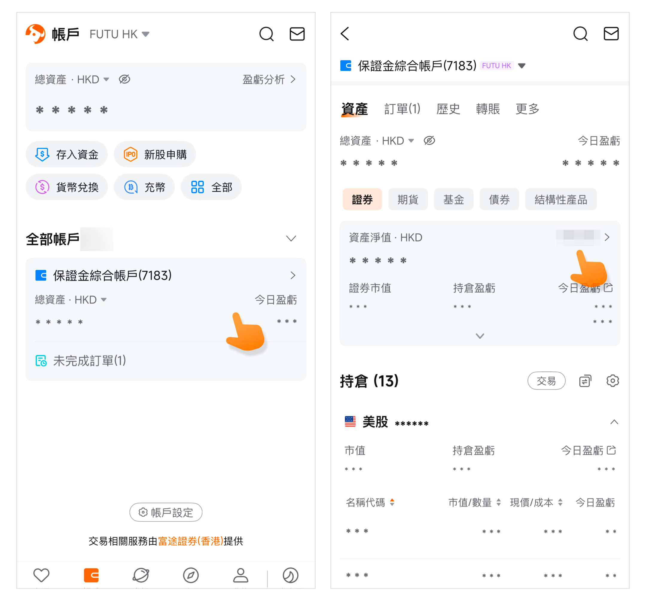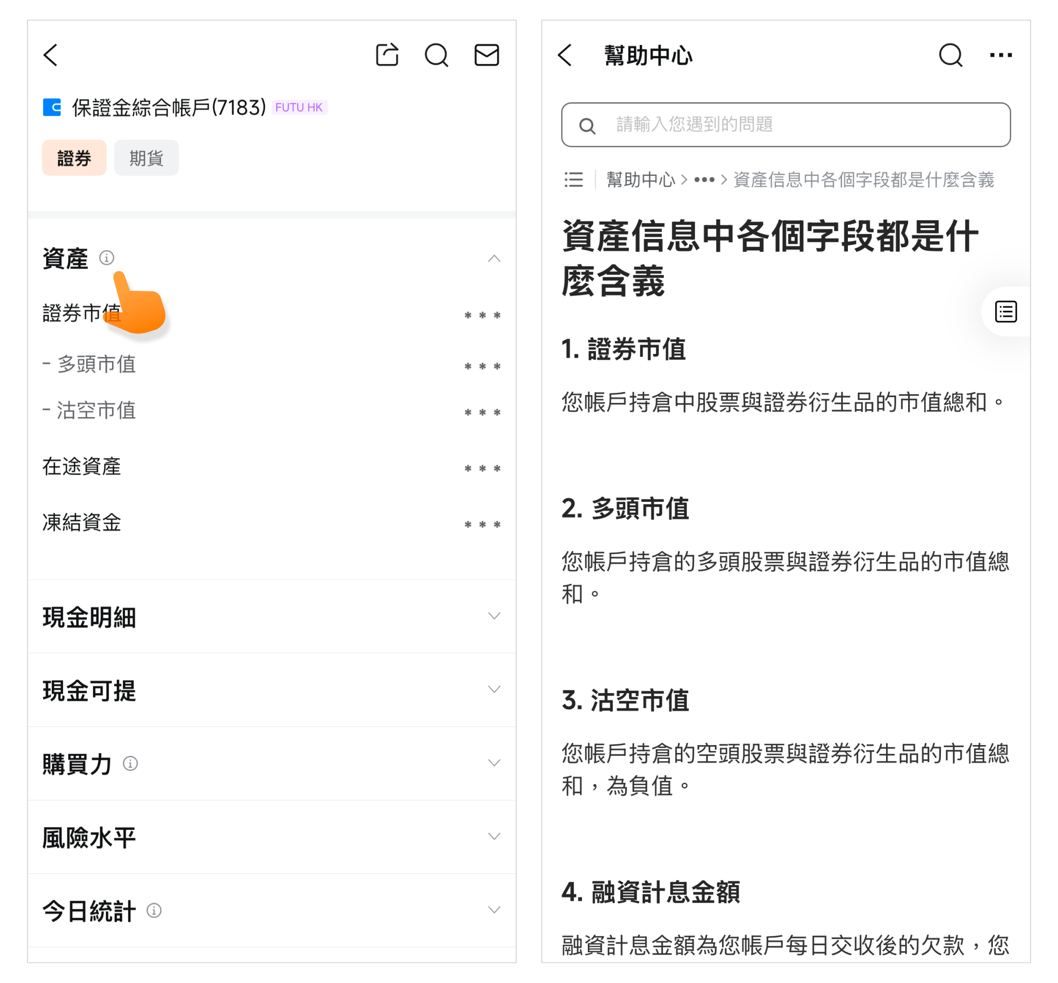 「资产总览」模块为您提供6个模块的信息,帮您全方位了解账户状态,包括:当前账户资产(包括持仓证券市值、在途资产、冻结资金)、现金明细(当中可查看是否存在不同币种的欠款)、现金可提、购买力、风控水平、今日交易统计。