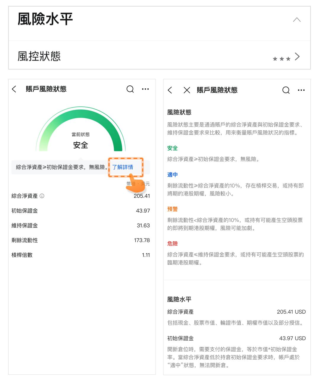 如果您使用了融资,请留意账户的「风险水平」模块。该模块展示了您当前账户的风险状态、杠杆倍数、剩余流动性、初始保证金和维持保证金。