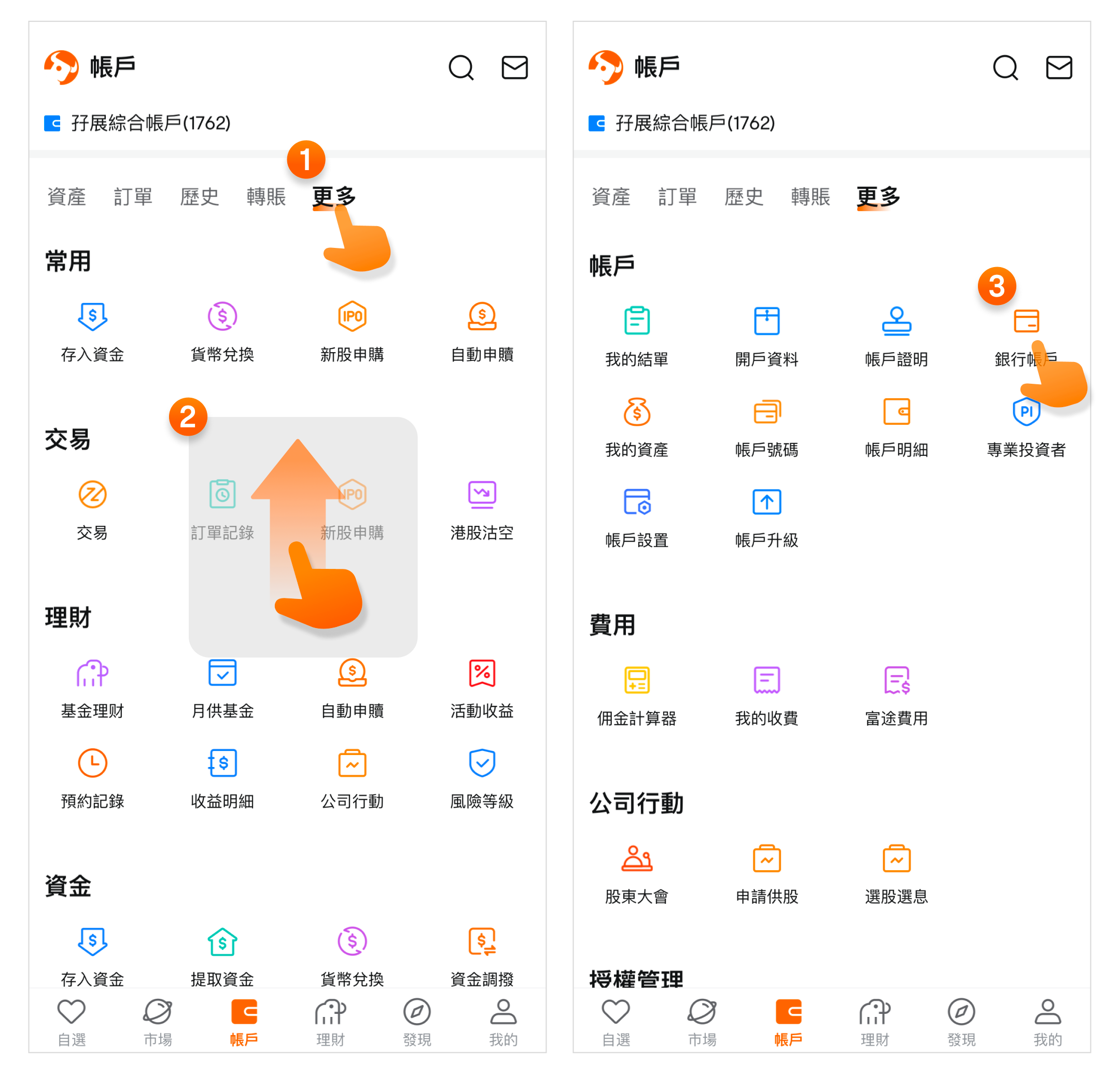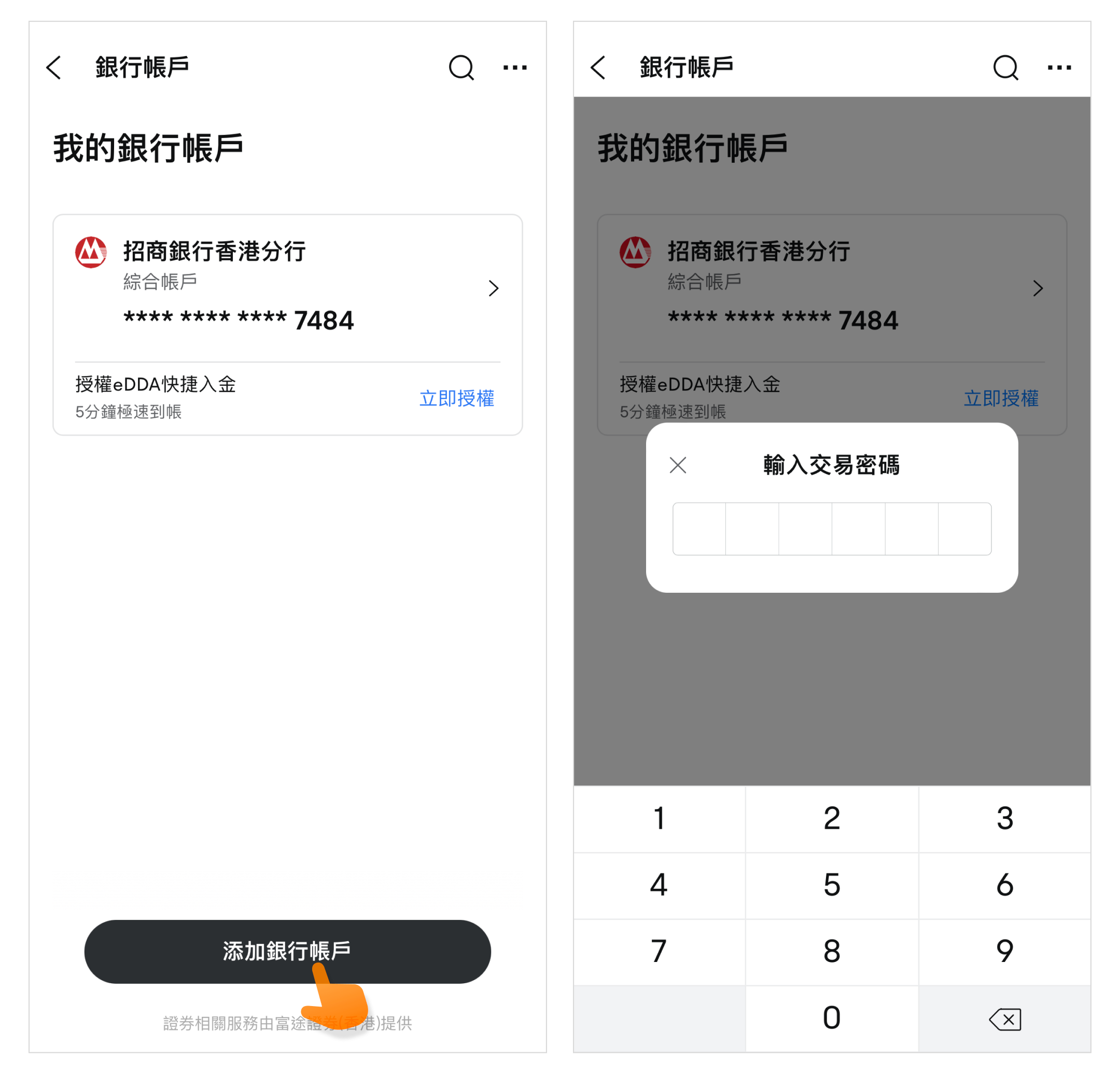 此外,通过点击「添加银行账户」,输入交易密码后您便可添加银行账户。