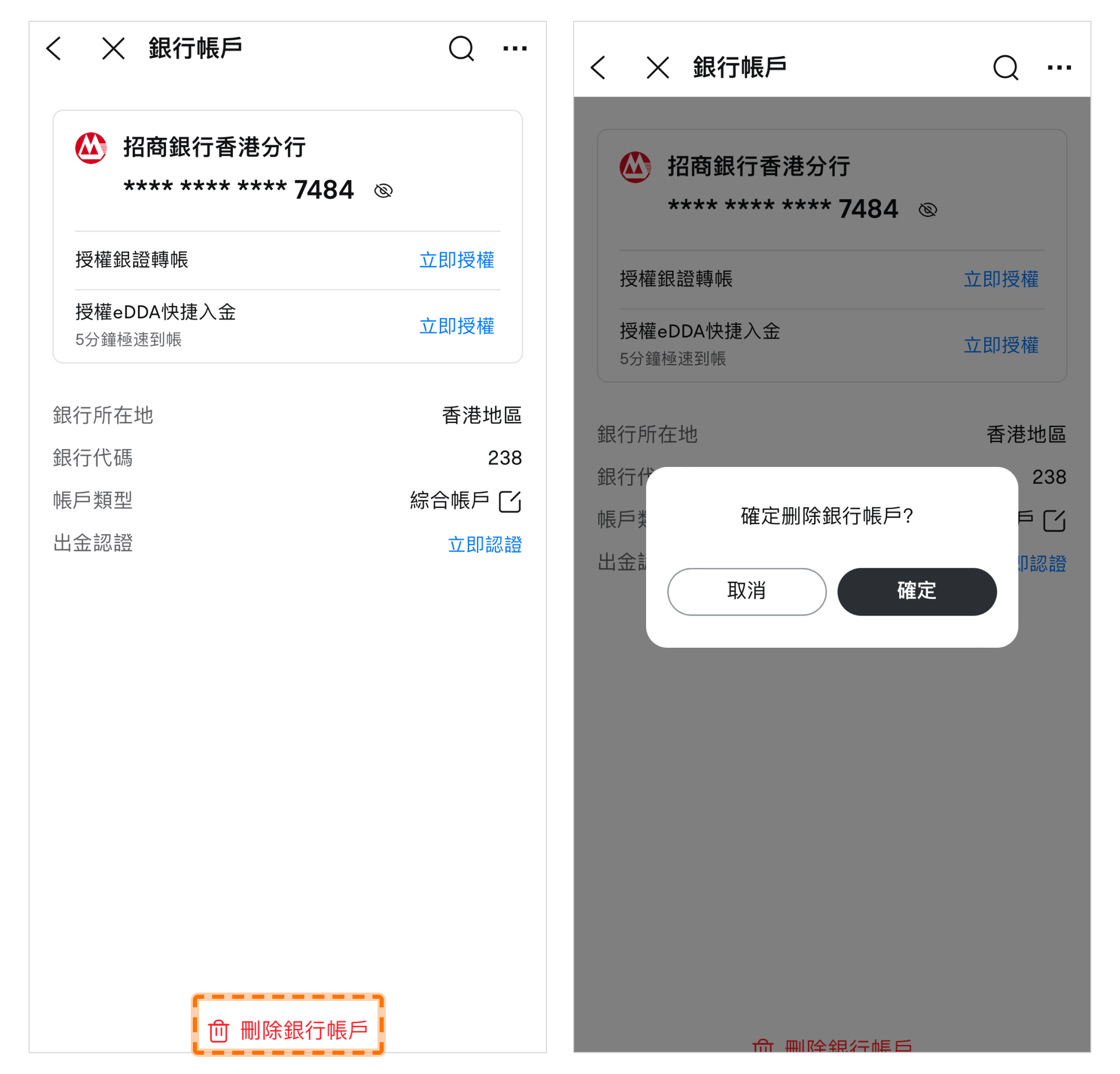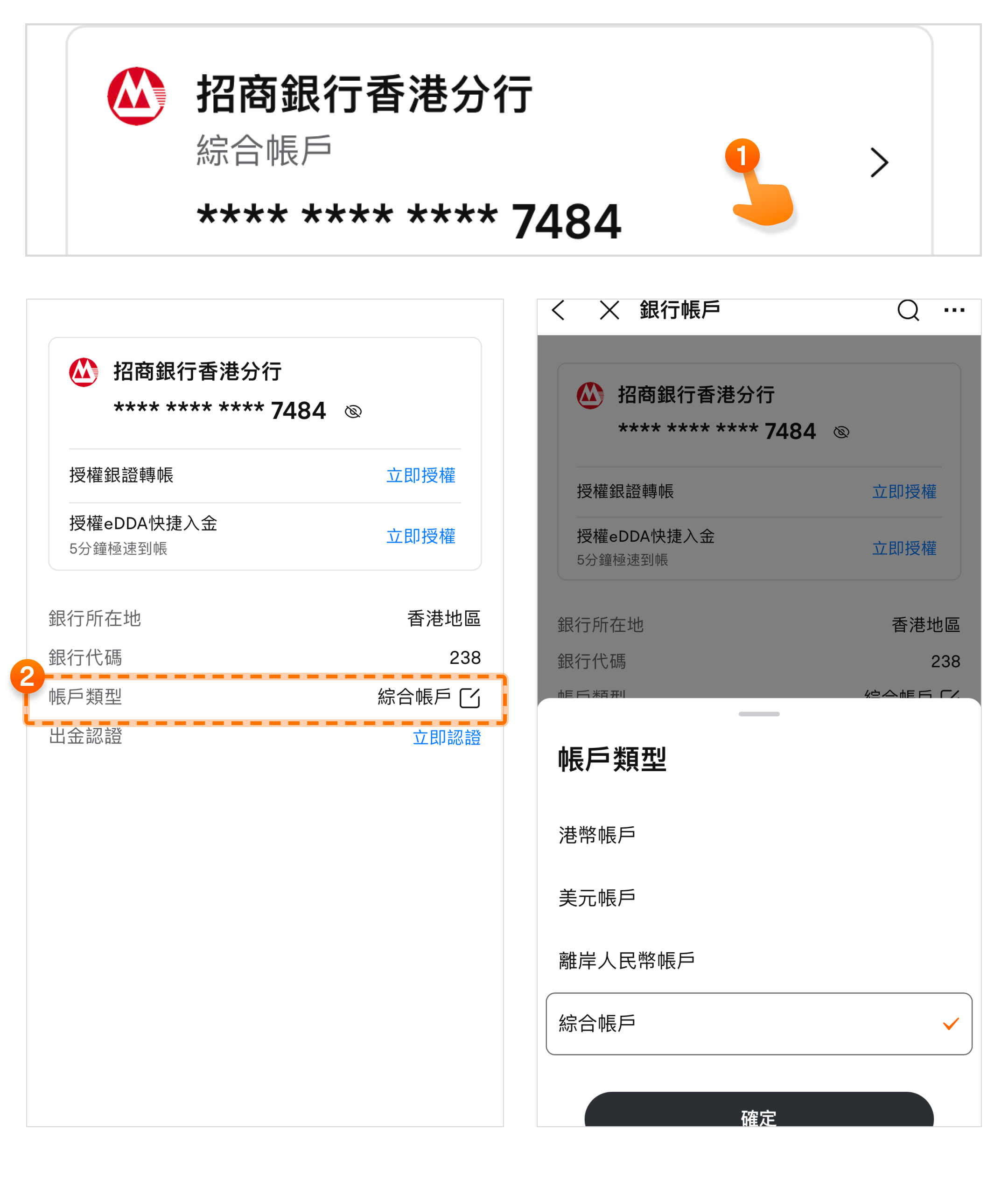 通过点击任意银行账户,您可在此了解您银行账户的详情:银行所在地、银行代码、账户类型与出金认证。点击账户类型的「编辑」按钮,您可修改您的账户类型:港币账户、美元账户、离岸人民币账户或综合账户,点击确认即可修改成功。