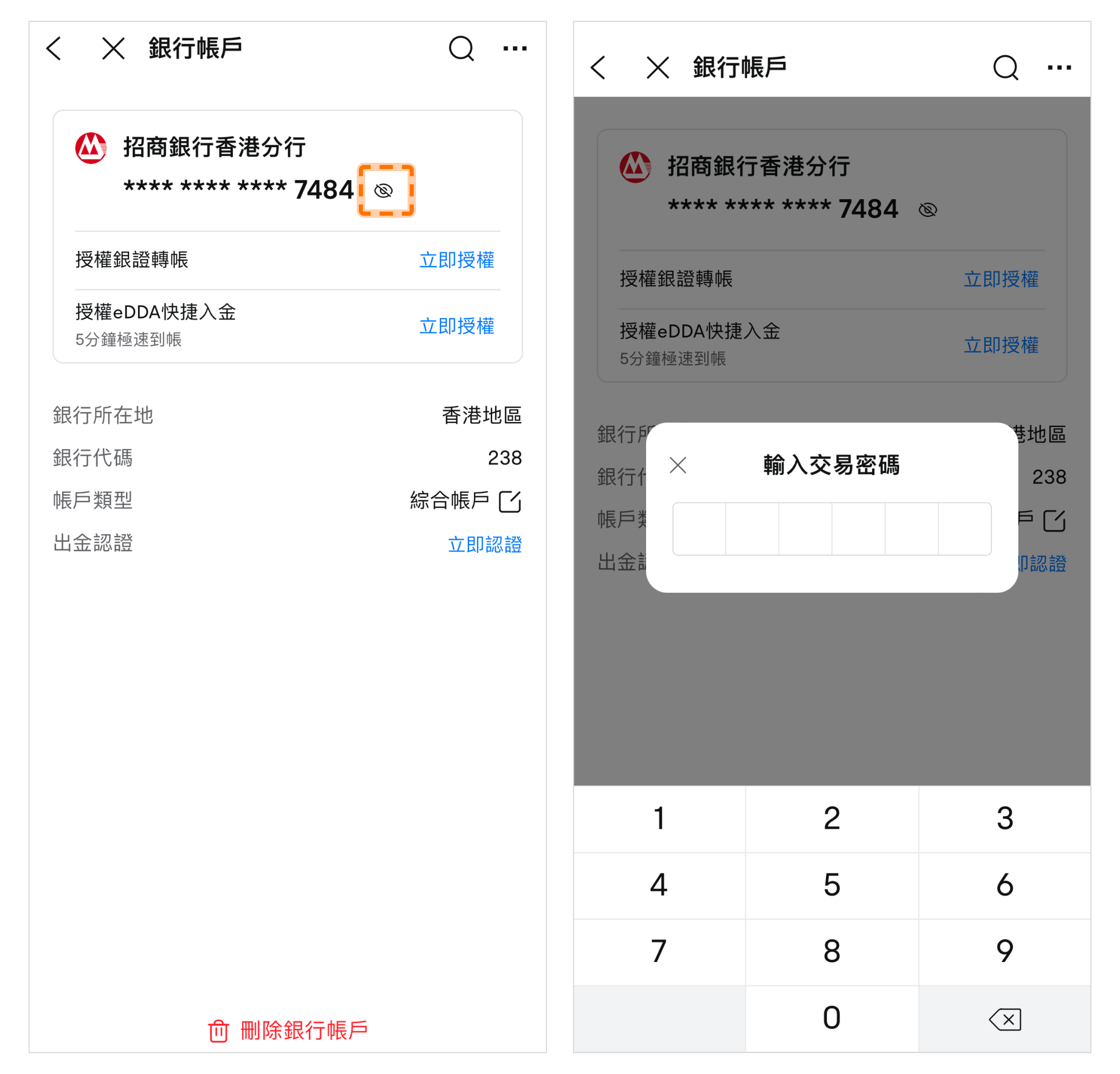 点击账号号码右侧的「眼睛」按钮,输入交易密码后即可查看您的账号号码。