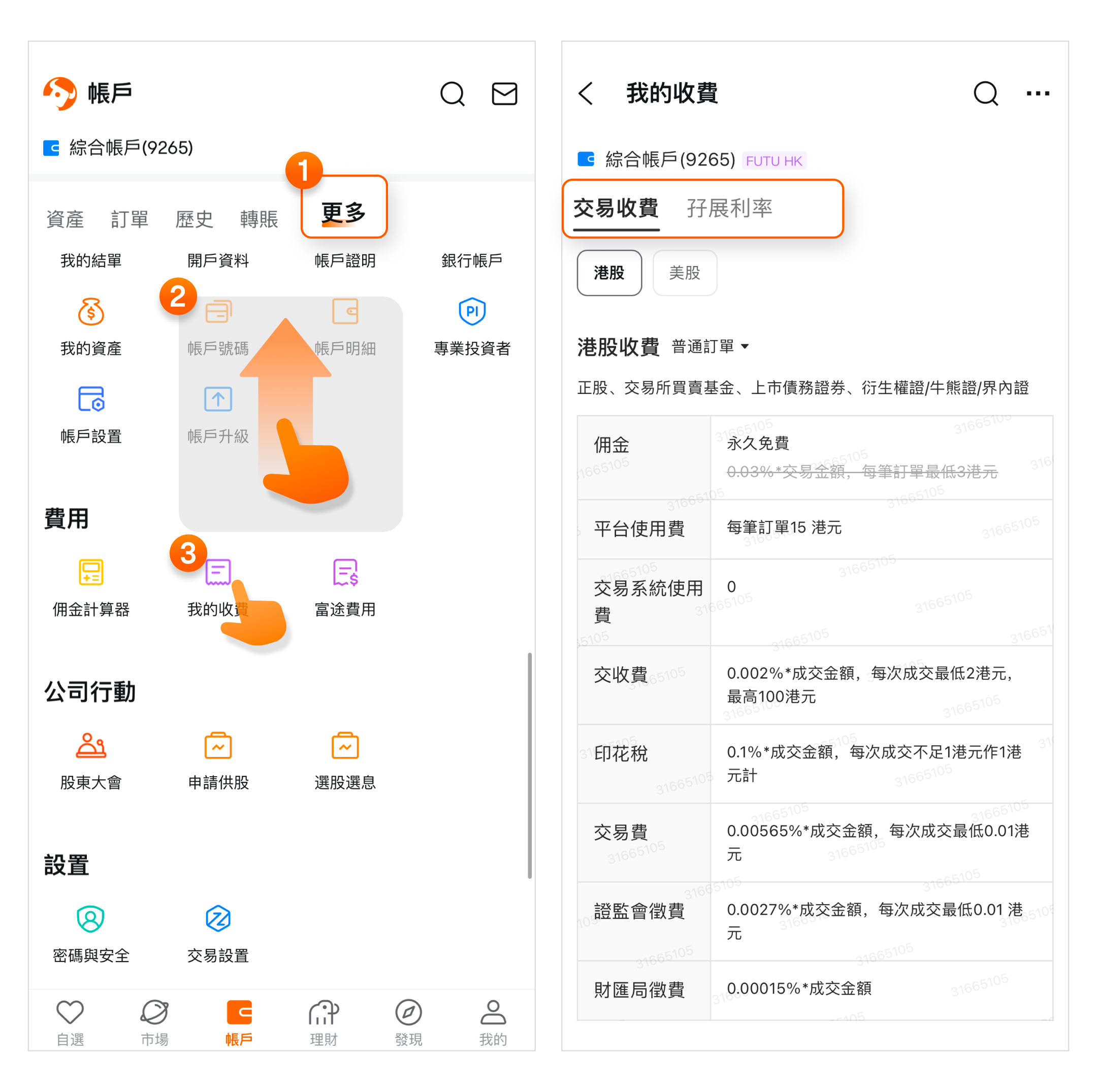 路径:账户页>选择具体账户>更多>费用>我的收费。费用信息包括交易收费和孖展利率两大类。