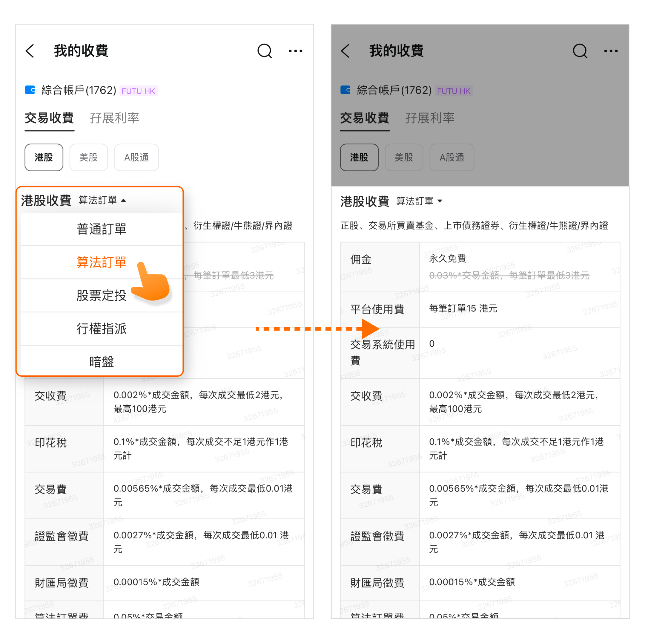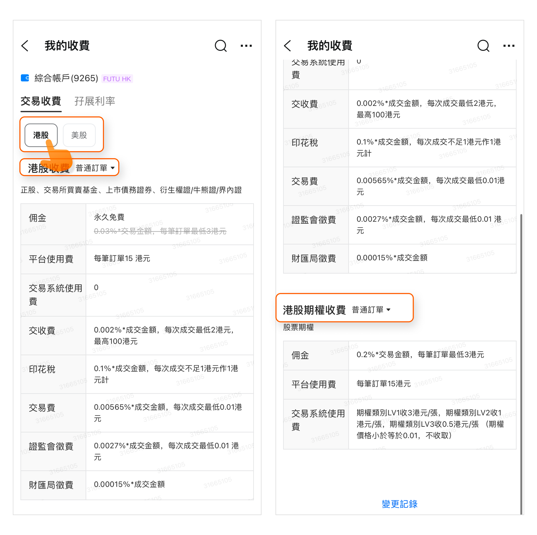 「交易收费」分为港股和美股收费,其下又分为港股/美股和港股/美股期权。