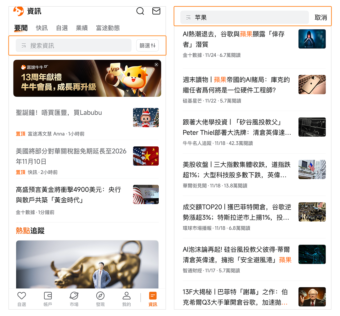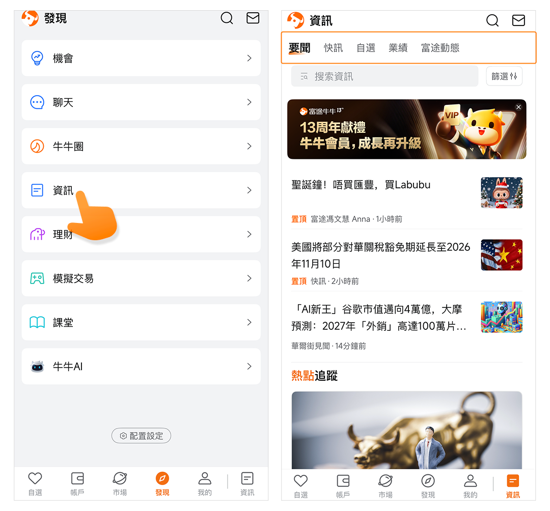資訊頁由「要聞」、「快訊」、「自選」、「業績」、「富途動態」五個子選單欄組成,您可在此處了解股票市場的最新消息動態。