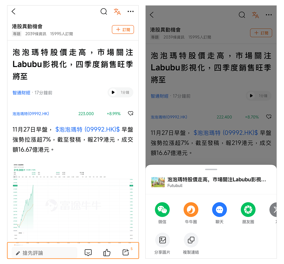 在頁面下方,您可以進行評論、按讚、分享給您的朋友或社交平台。富途牛牛支持以連結或圖片的形式分享平台內的文章資訊。