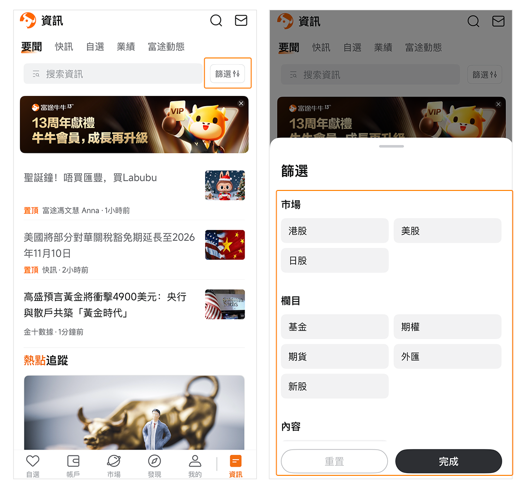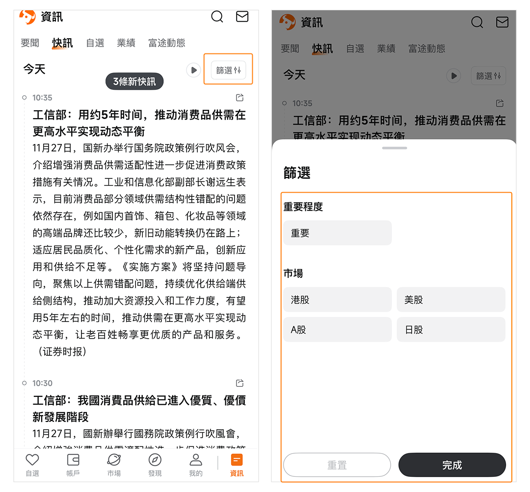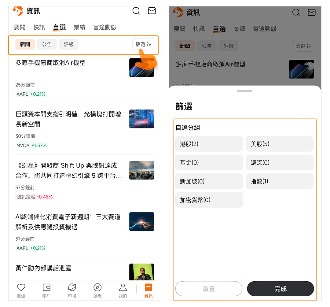 點擊「篩選」,您可在自行選擇您想查看的股票類型:美股/港股/日股;欄目:基金/期權/期貨/外匯/新股;內容:視頻等,點擊「完成」即可。