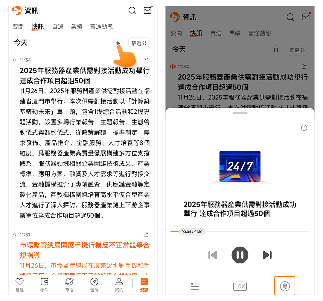 「快訊」頁預設以時間軸順序為您展示最新資訊。點擊「播放」,您可免費收聽粵語/英語/普通話三種版本的有聲新聞。
