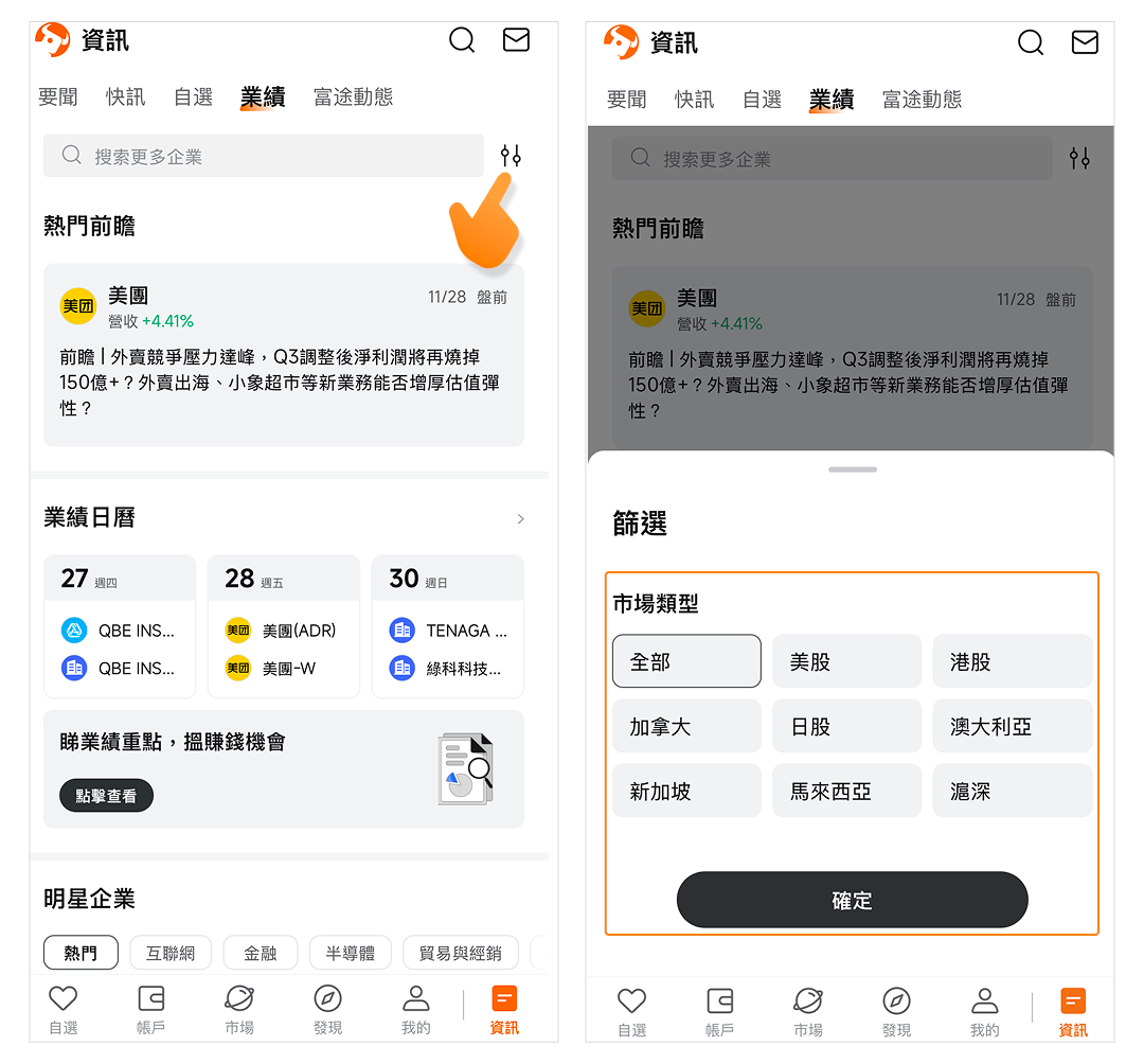 「業績」頁您可在此處查看市場最新公佈的業績資訊。點擊「篩選」,您可自行選擇市場類型:美股/港股/加拿大/日股/澳大利亞/新加坡/馬來西亞/滬深