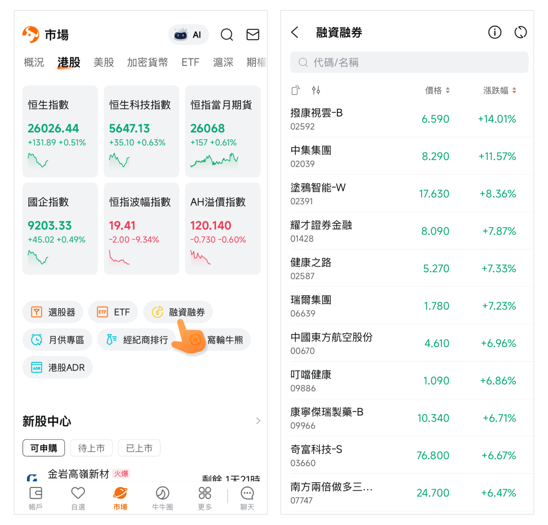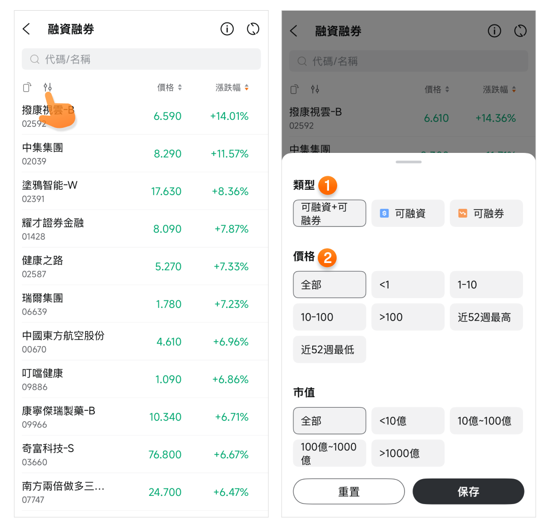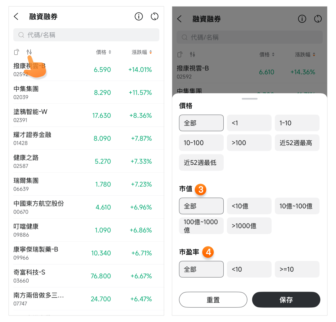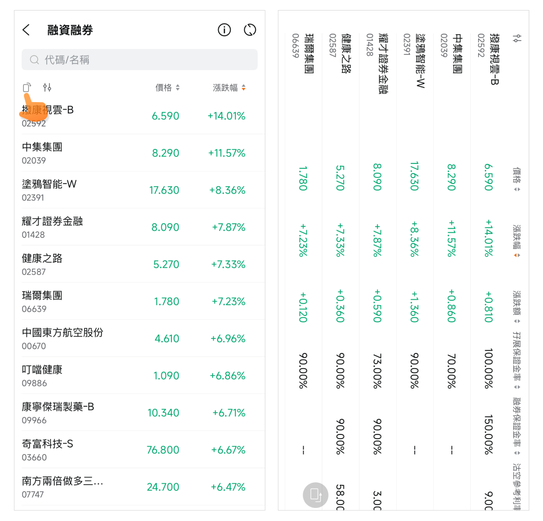 「融資融券」页由頂部篩選器和下方的股票數據組成。通過上方的篩選器您可以篩選出符合您需求的股票,下方的股票數據會根據您的選擇實時變動。另有橫熒幕顯示功能供您選擇。