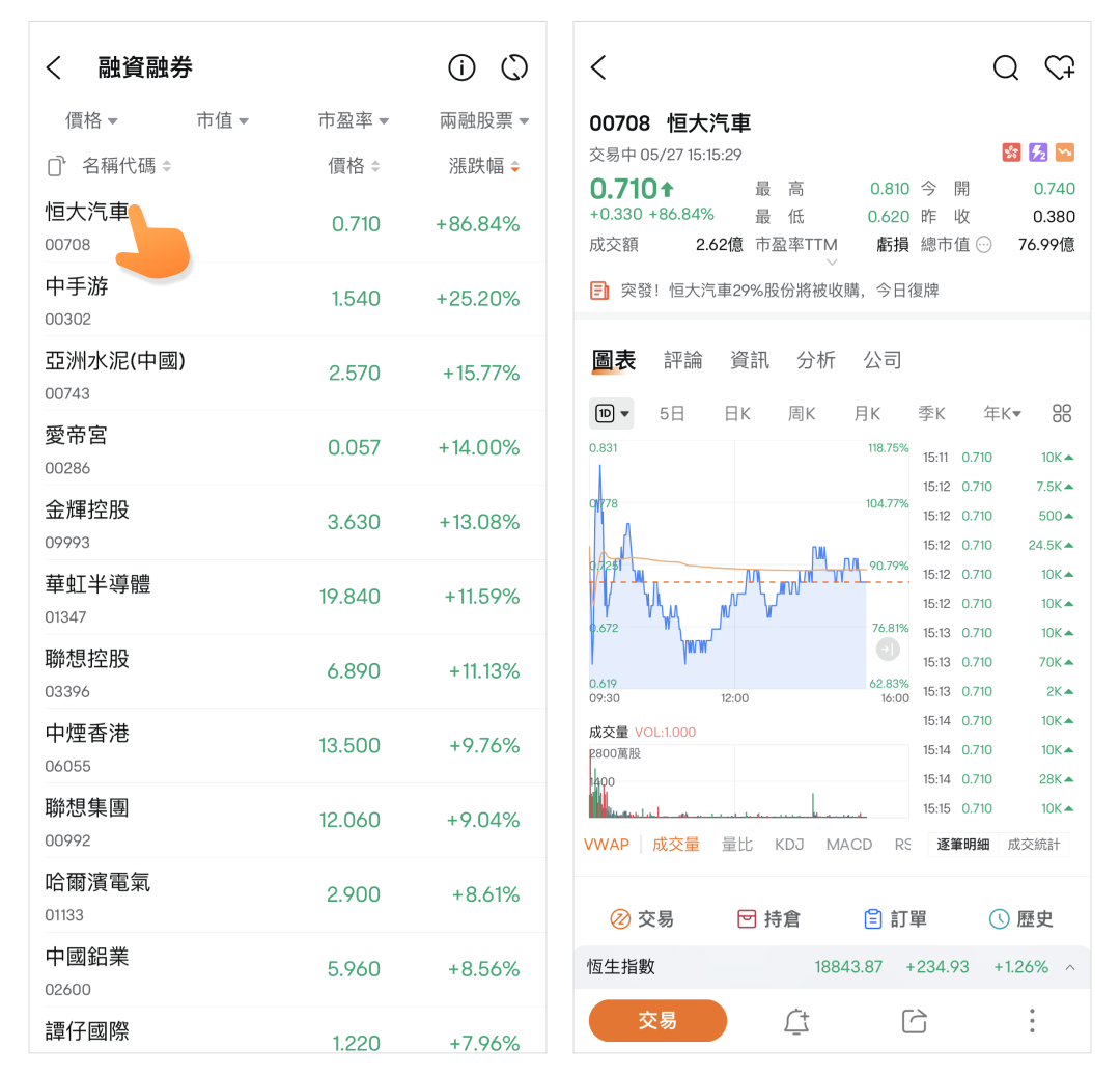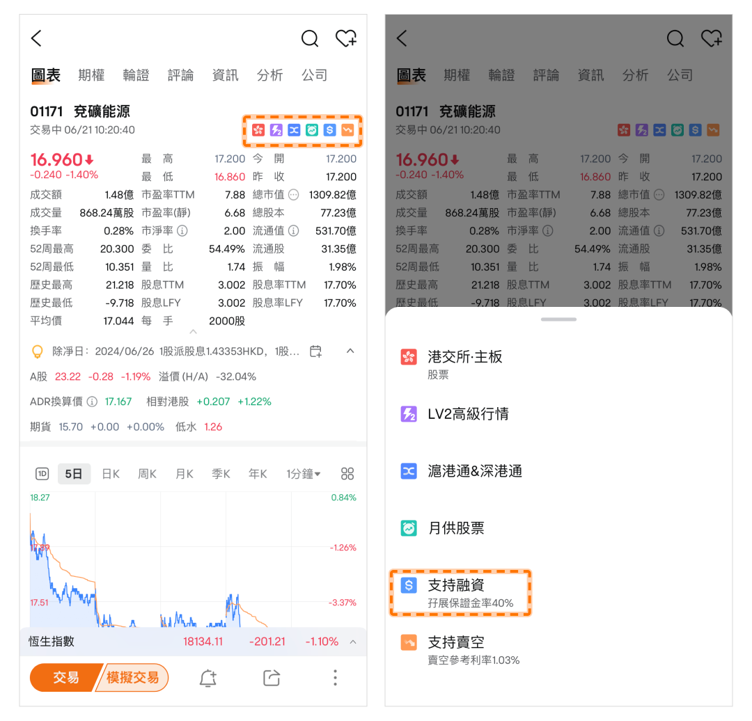 此外,你也可以進入個股報價頁透過圖表快速知道這個股票是否支持融資融券。