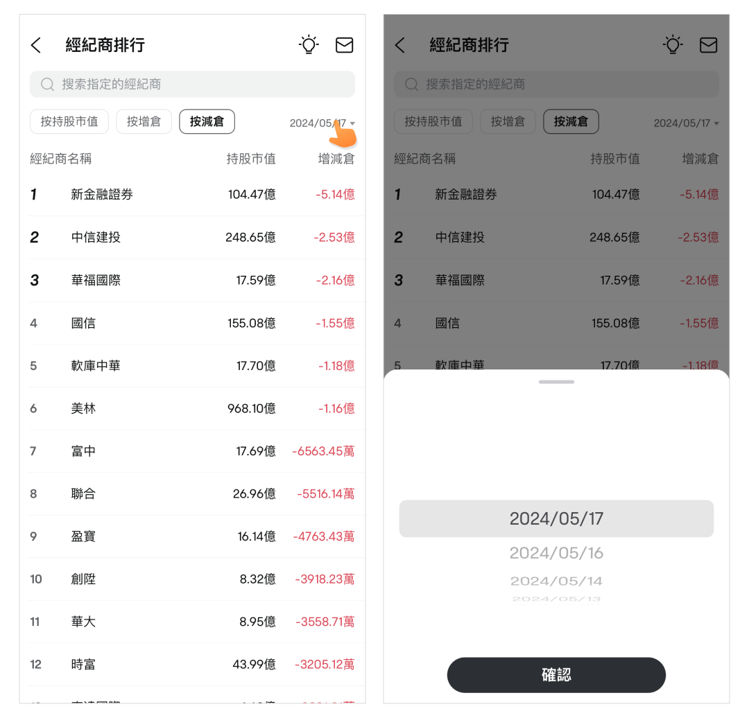 「經紀商排行」页的第二個子功能模塊是,頂部菜單欄,您可在此處進行條件篩選,如按持股市值、按增倉、按減倉等條件來進行篩選。此外頂部菜單欄的右側還有時間篩選器供您選擇,下方的數據會根據您的篩選實時變更。該頁面默認按持股市值來展示當日數據。