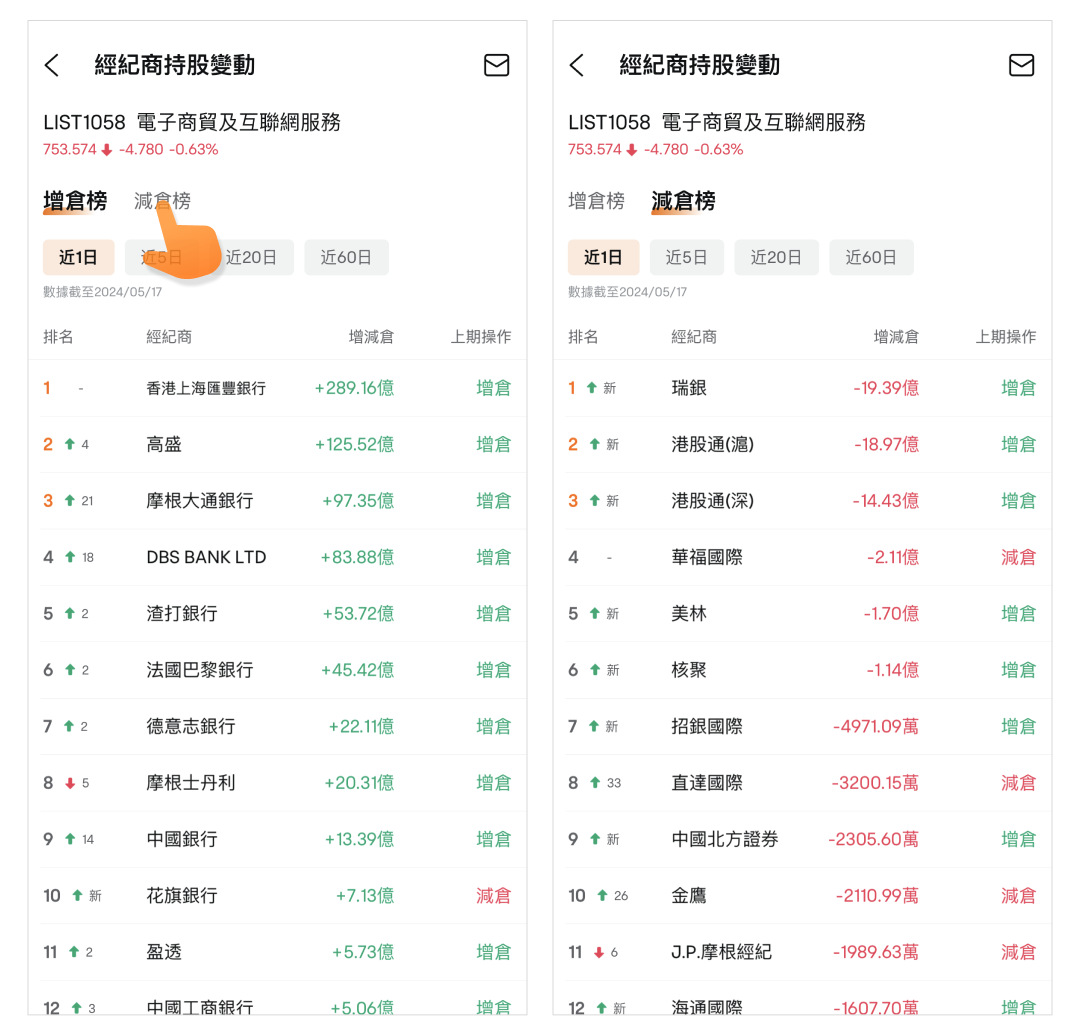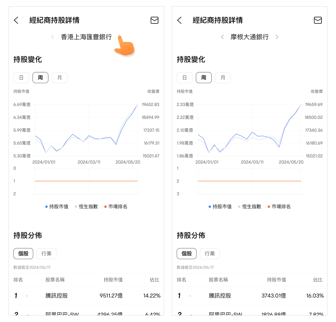路徑:市場頁>港股>亮點工具>經紀商排行>經紀商持股詳情>經紀商切換。