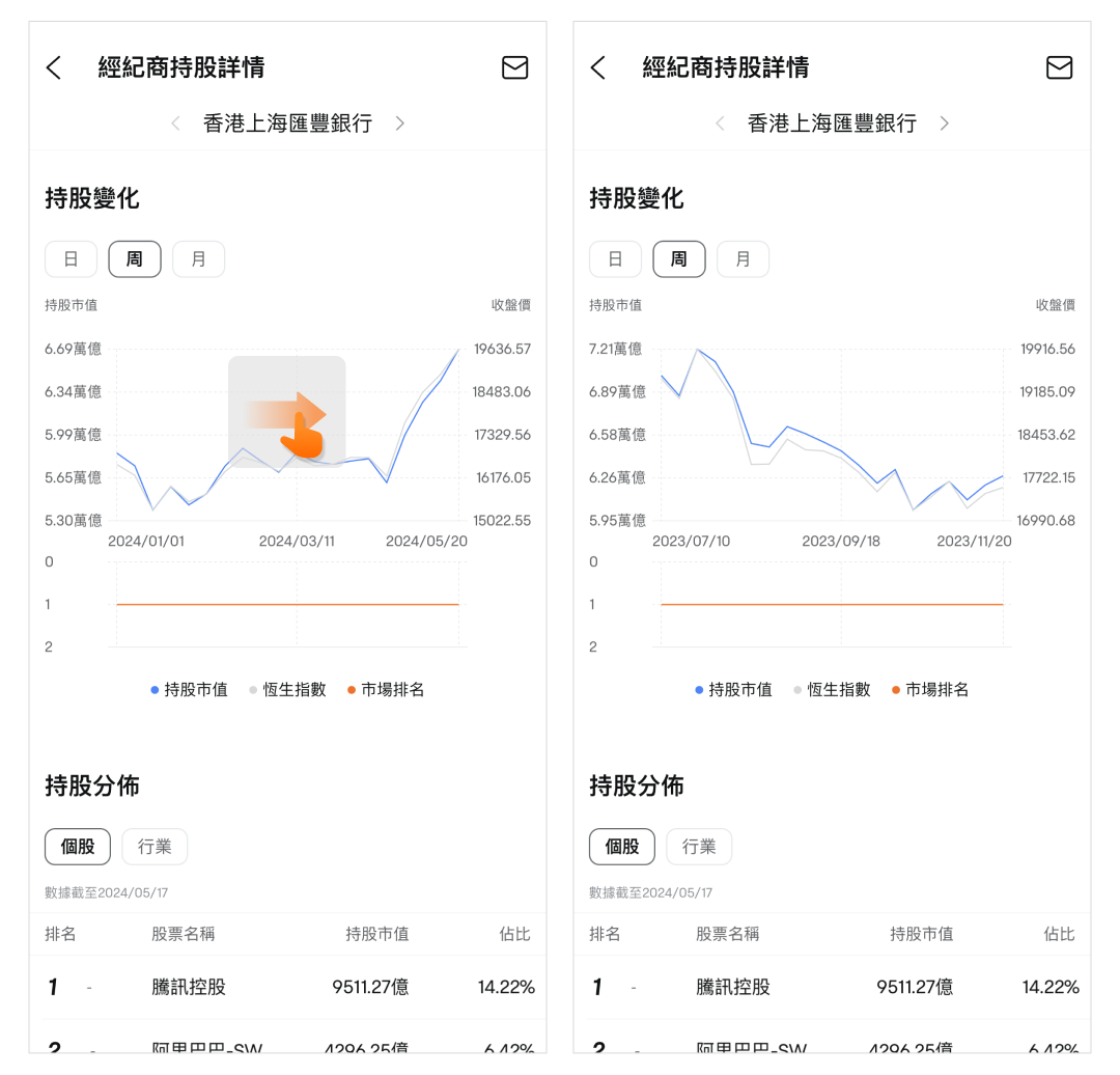 在「經紀商排行」页篩選出所需了解的經紀商名單後,您可通過點擊經紀商名稱進入到「經紀商持股詳情」頁來了解其詳細數據。「經紀商持股詳情」頁從上往下依次是經紀商切換、持股變化、持股分佈等功能模塊。