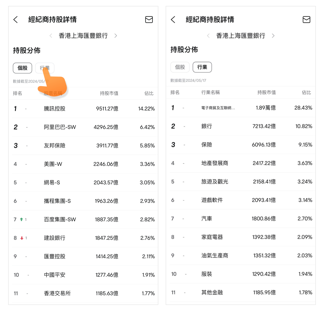 路徑:市場頁>港股>亮點工具>經紀商排行>經紀商持股詳情>持股分佈>行業。