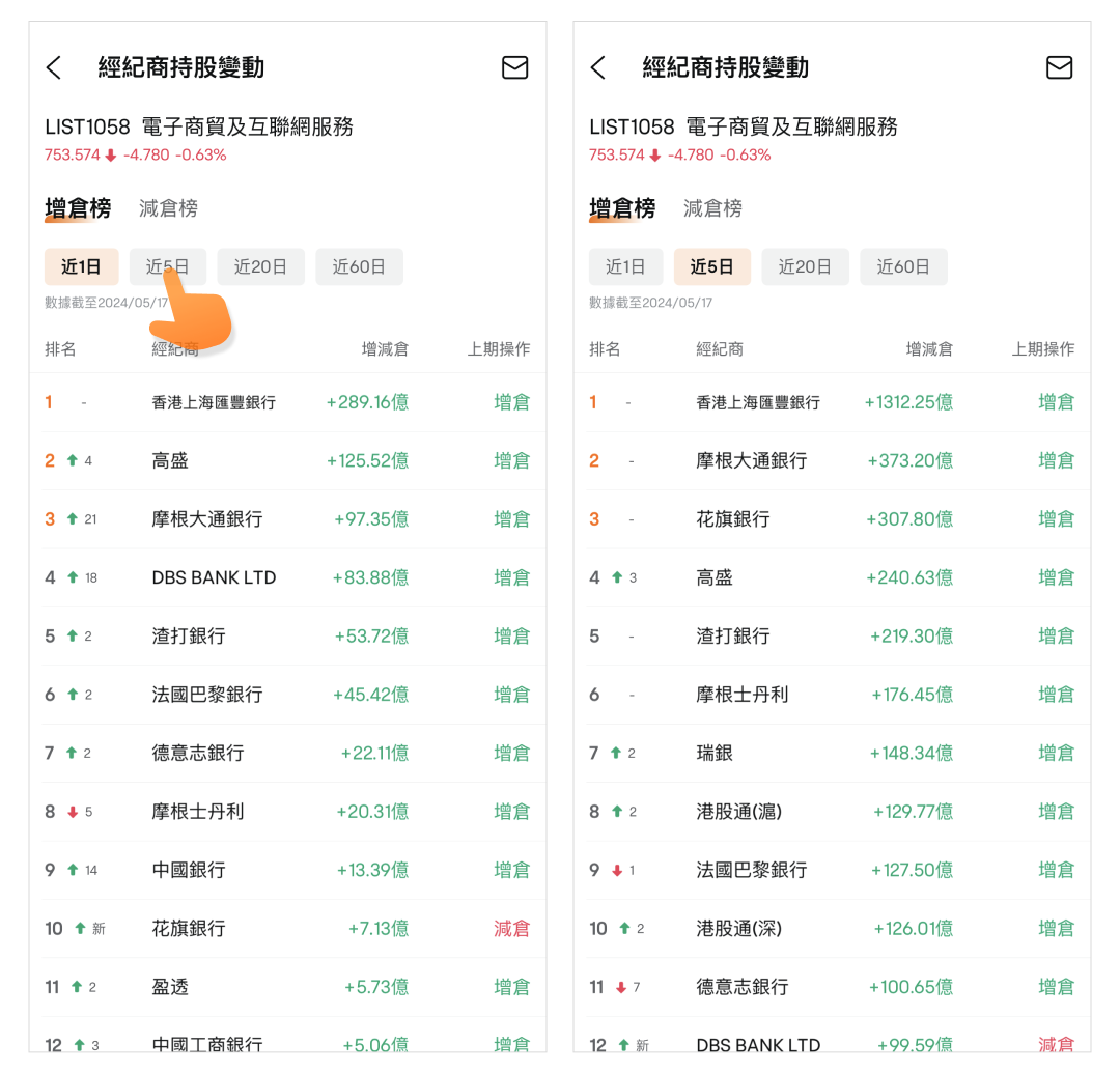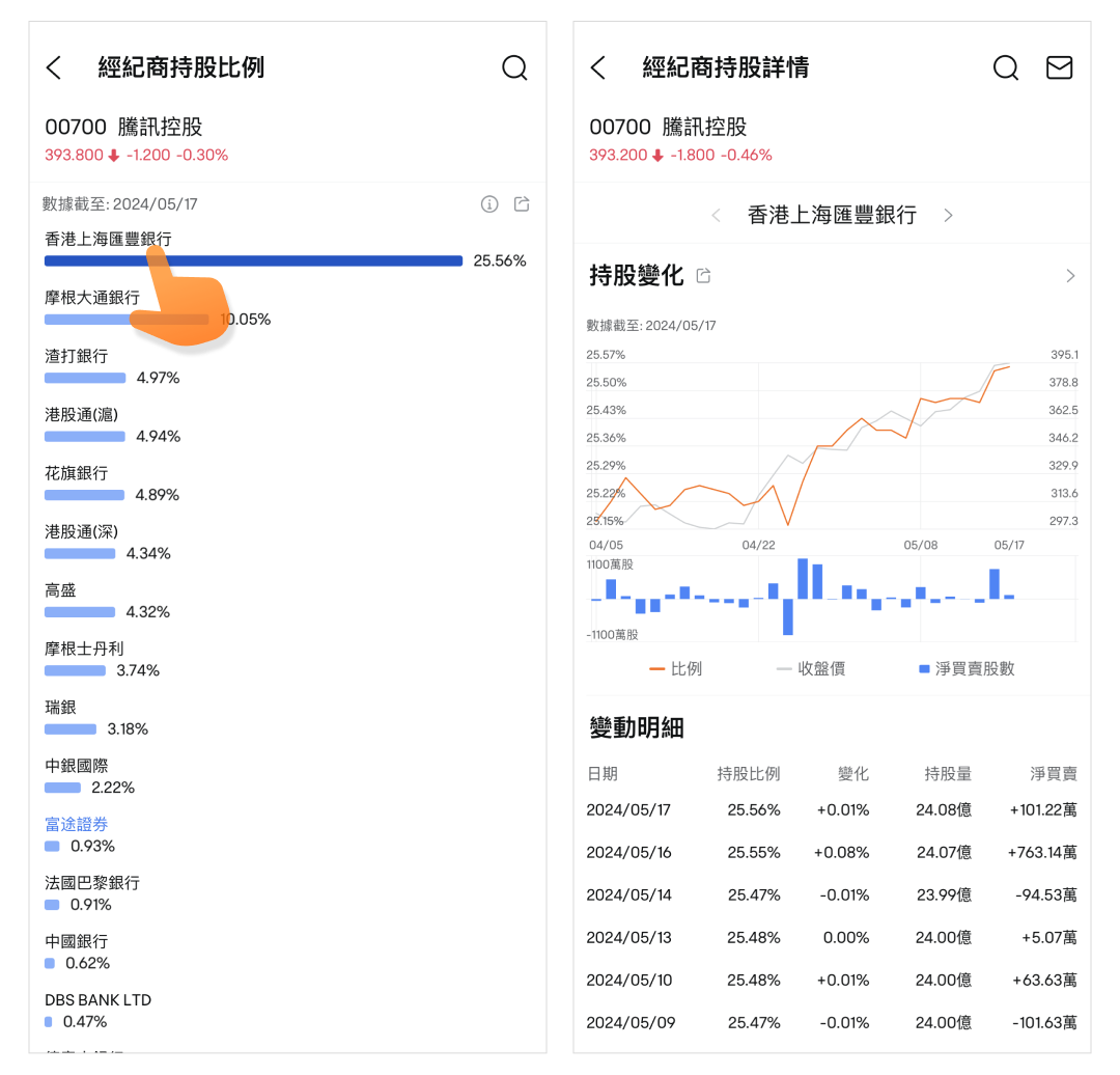 路徑:市場頁>港股>亮點工具>經紀商排行>經紀商持股詳情>持股變化。