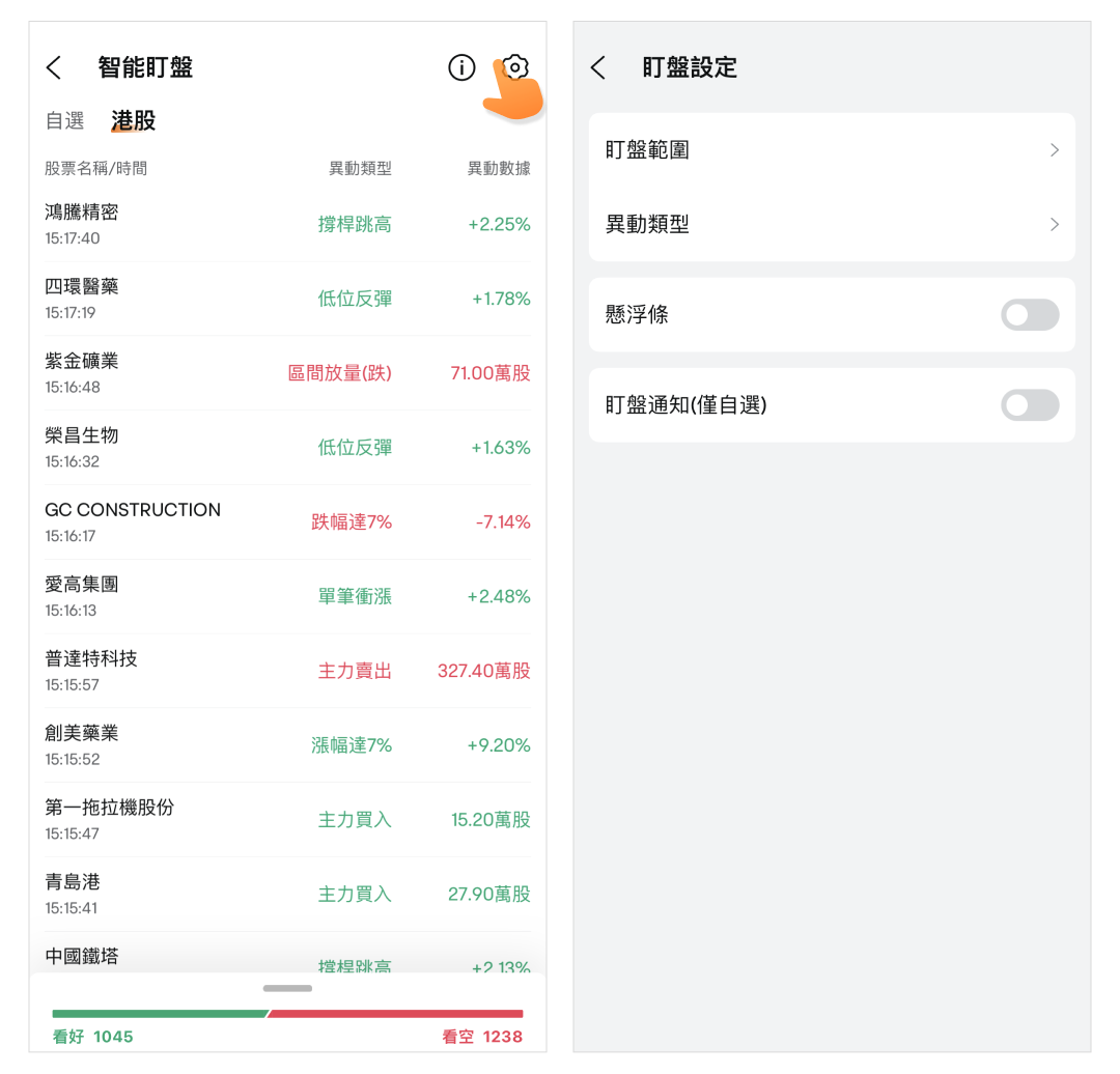 為了更高效地使用該功能,您首先需要點選右上角的「設置」按鈕來進行盯盤設定。盯盤設定的詳細設定類型包括盯盤範圍、異動類型等。此外還提供了懸浮條及盯盤通知(僅自選)的功能供您使用。