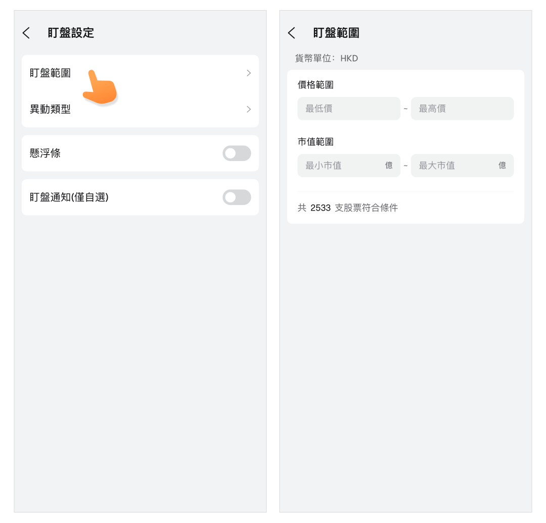 路徑:市場頁>任意市場>智能盯盤>盯盤設定>盯盤範圍