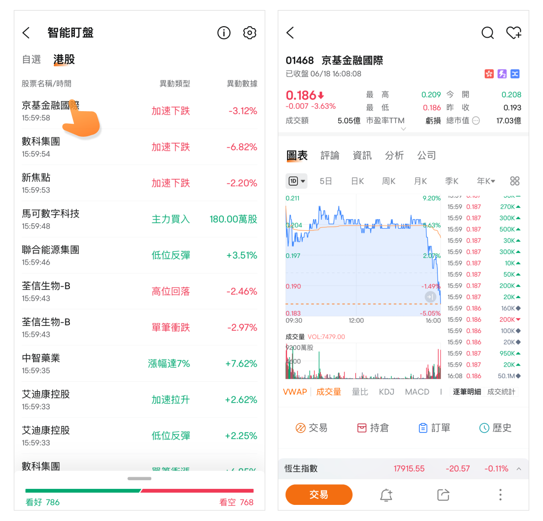 富途牛牛提供了智能盯盤服務。智能盯盤能夠幫助投資者實時監控各大市場所有股票的異動情況,免去手動設置監控條件,減少錯過買賣時機,發現更多投資機會。下面將以港股市場為例向您介紹。