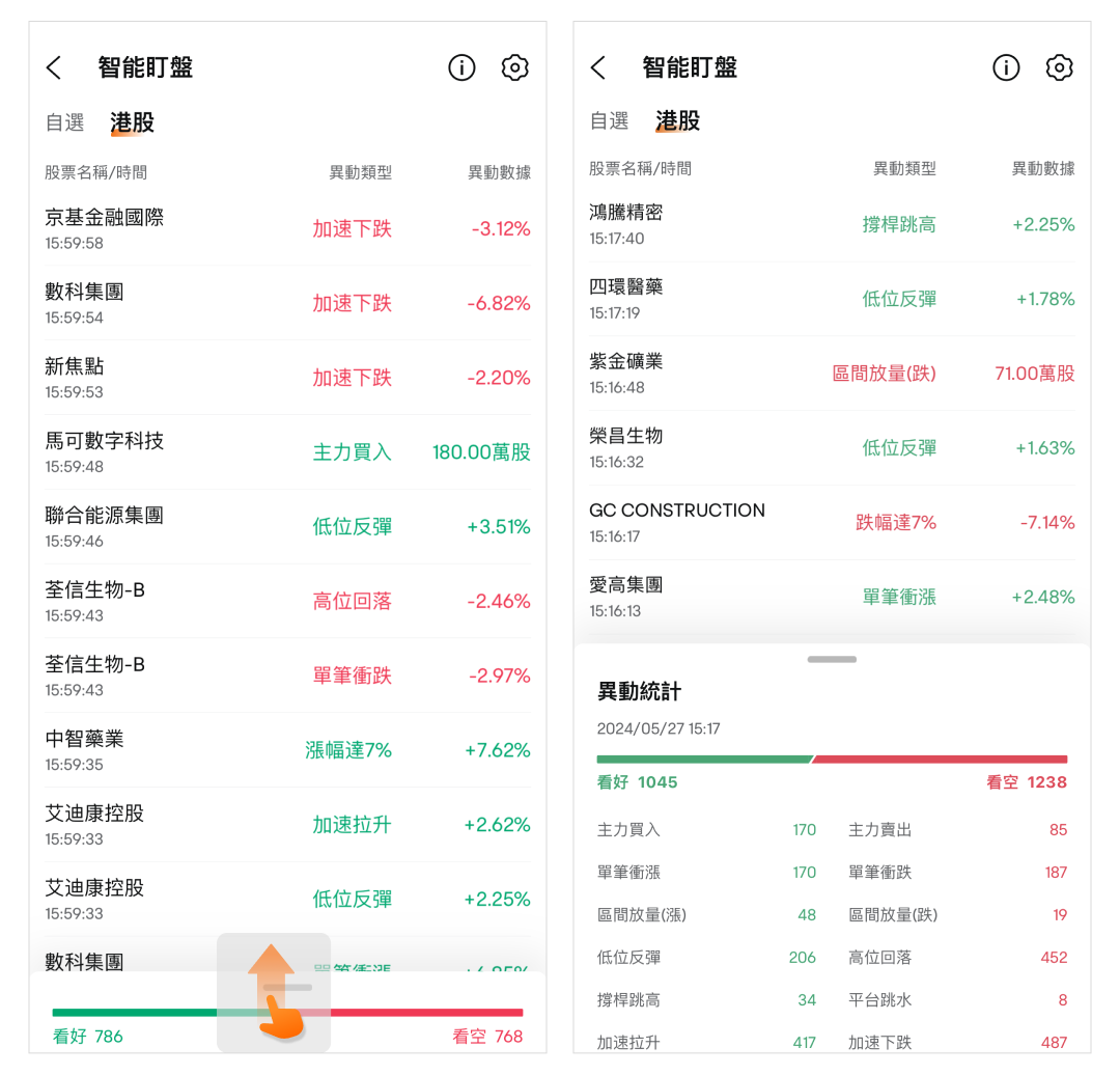 通過上拉異動統計您可查看詳細的異動統計數據信息,具體包括看好看空的股票數量、主力買入賣出等詳細數據。此外您還能通過下拉操作來隱藏異動統計。