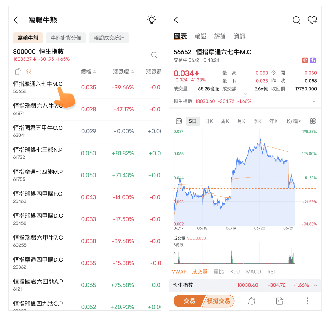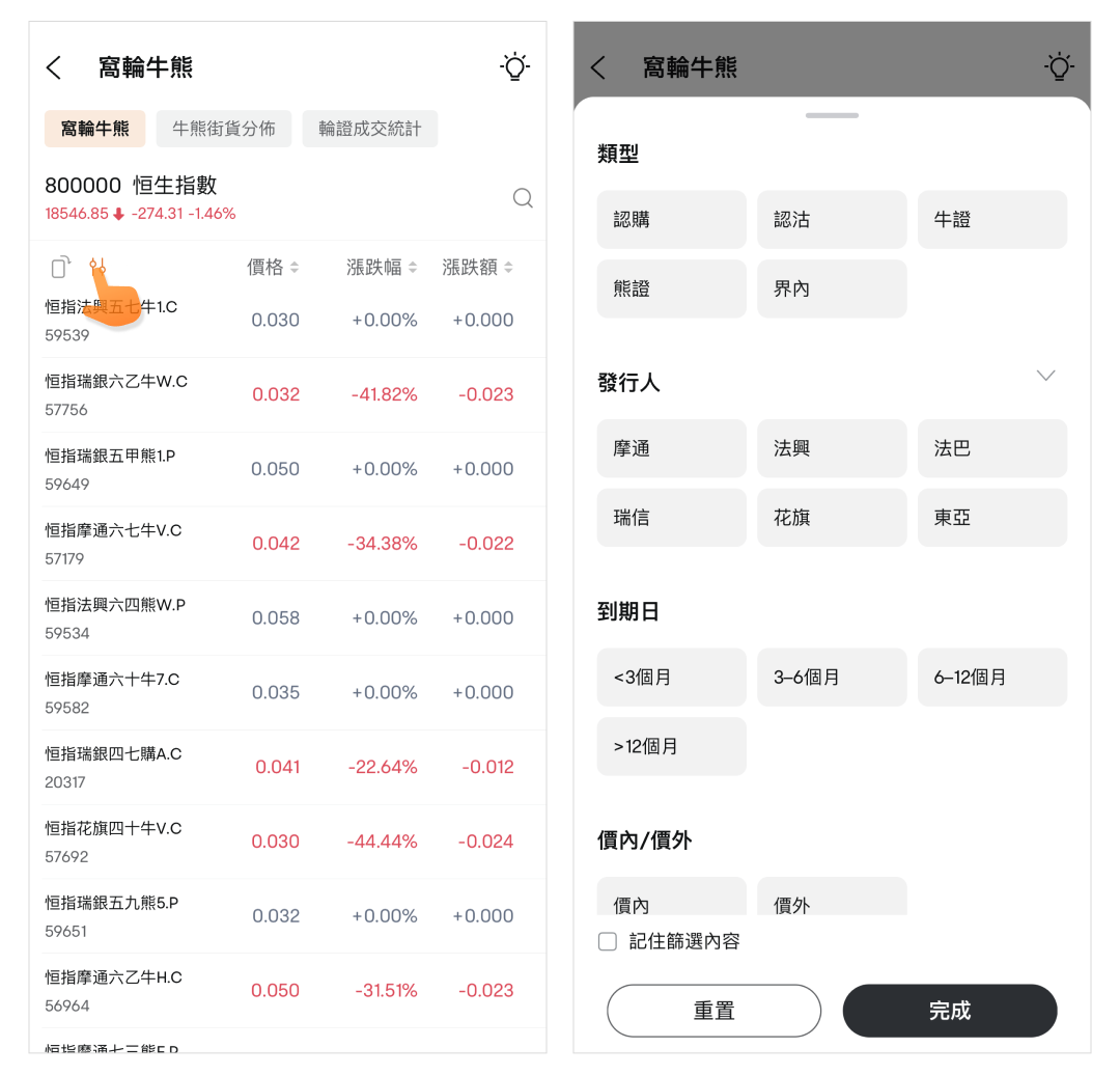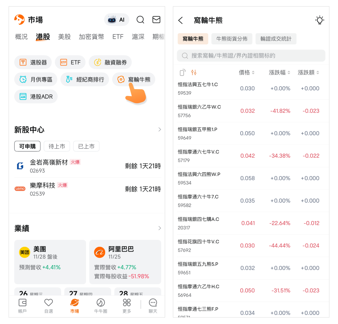 路徑:市場頁>港股>亮點工具>窩輪牛熊。
