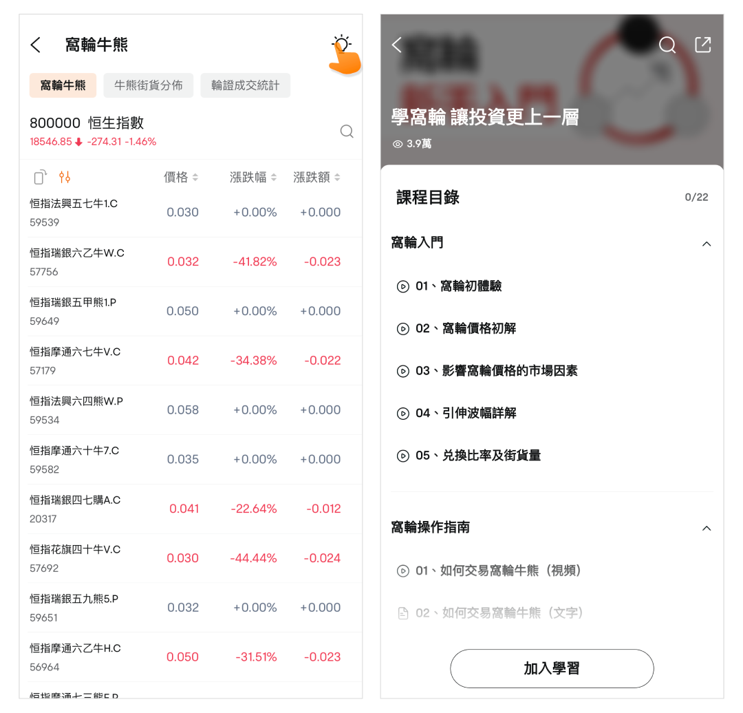 通過點選右上方的「燈泡」,您可進入窩輪牛熊的投資課程界面,幫助您系統了解窩輪牛熊。
