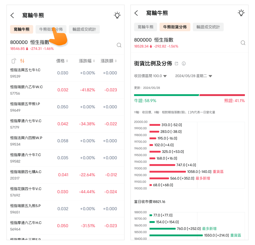 路徑:市場頁>港股>亮點工具>窩輪牛熊>頂部篩選器>牛熊街貨分佈。