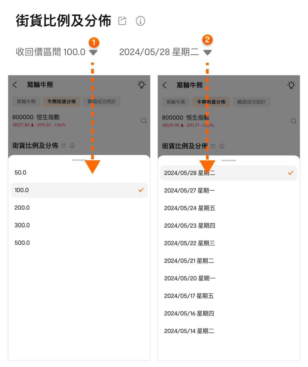 「窩輪牛熊」页的第二个子功能模塊是,牛熊街貨分佈,該功能向您展示市場上街貨比例及分佈。通過點選「街貨比例及分佈」文字下方的設置收回價區間和日期,您可篩選查看符合您需求的市場情況。