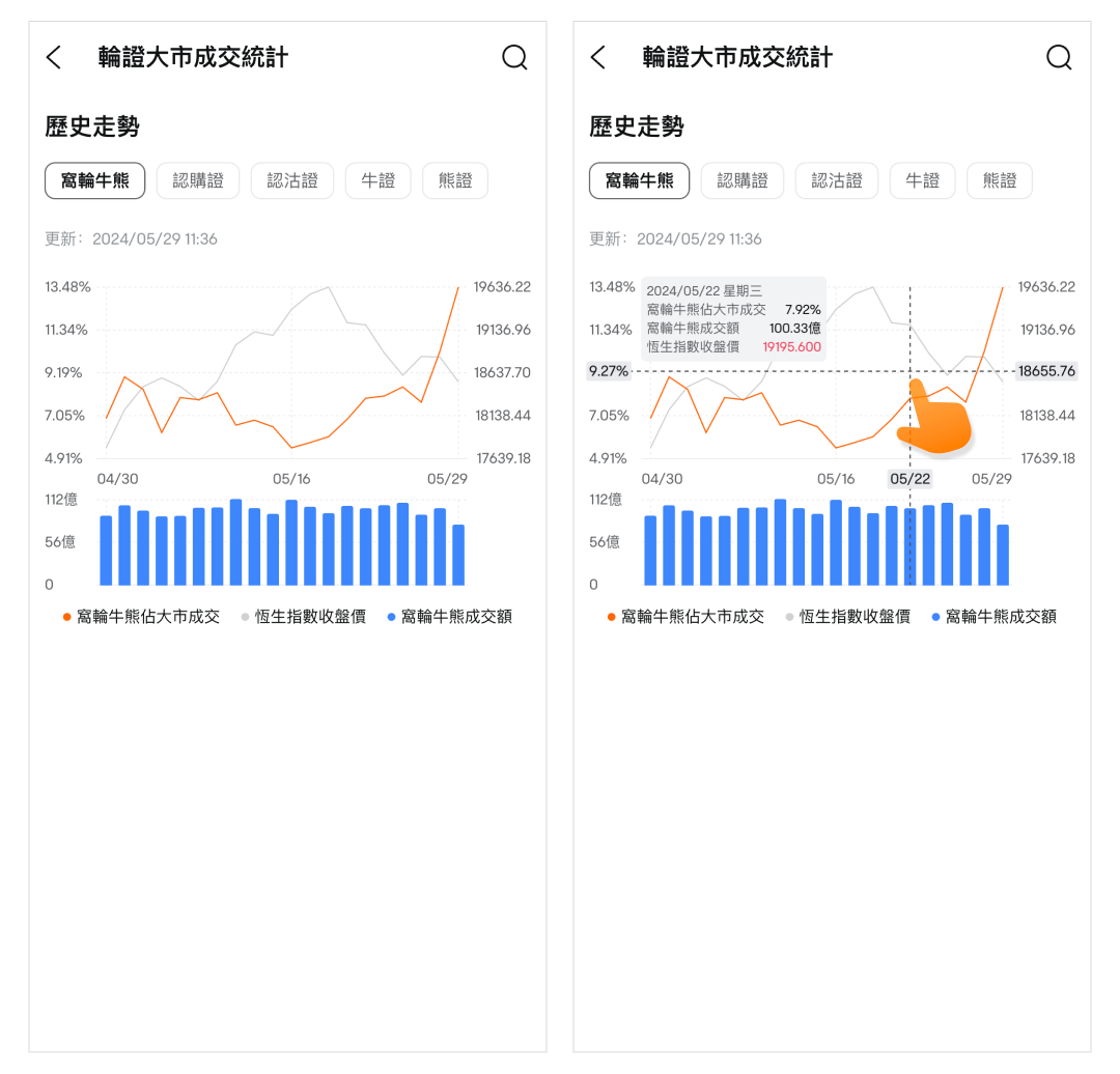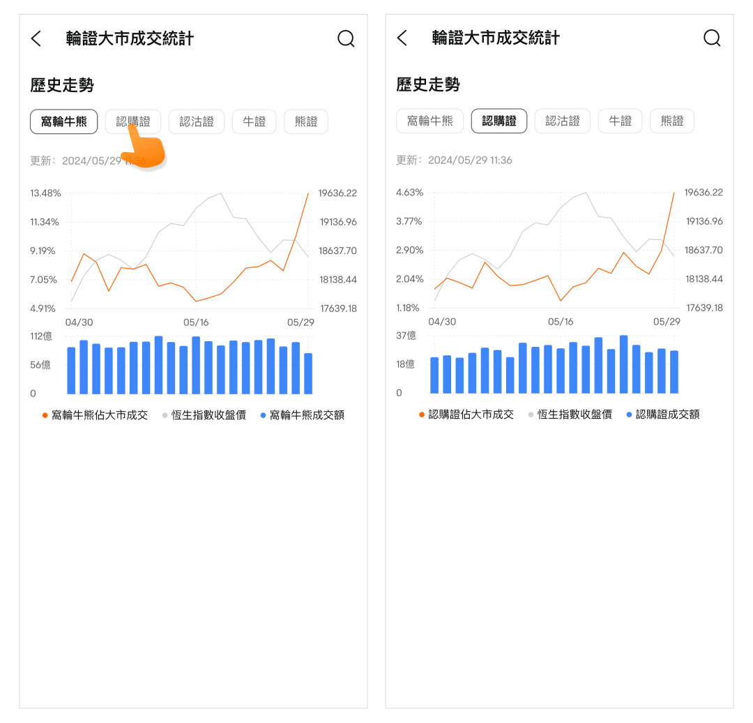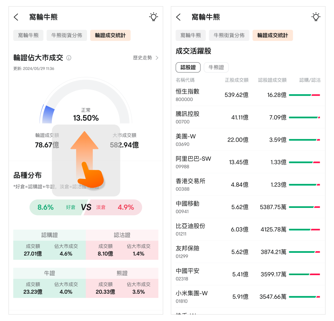路徑:市場頁>港股>亮點工具>窩輪牛熊>頂部篩選器>論證成交統計。