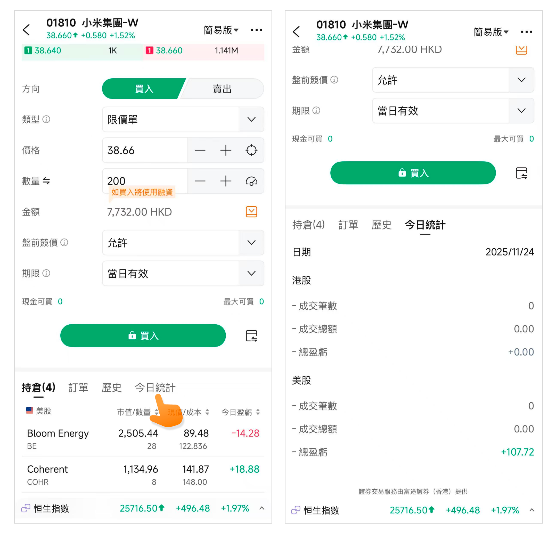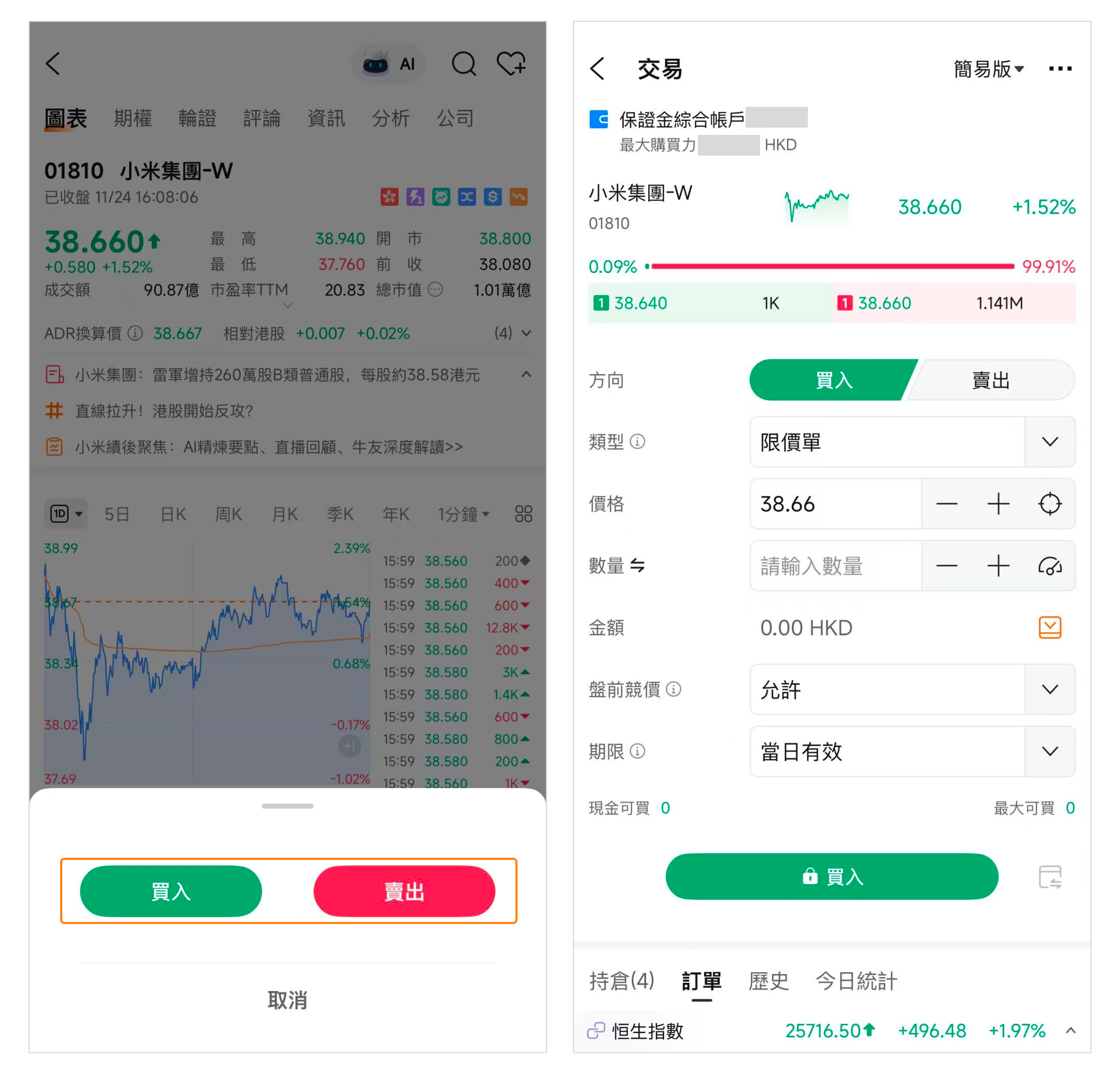 完成開戶入金後,你可以從個股頁下方的「交易」按鈕进入交易頁面。