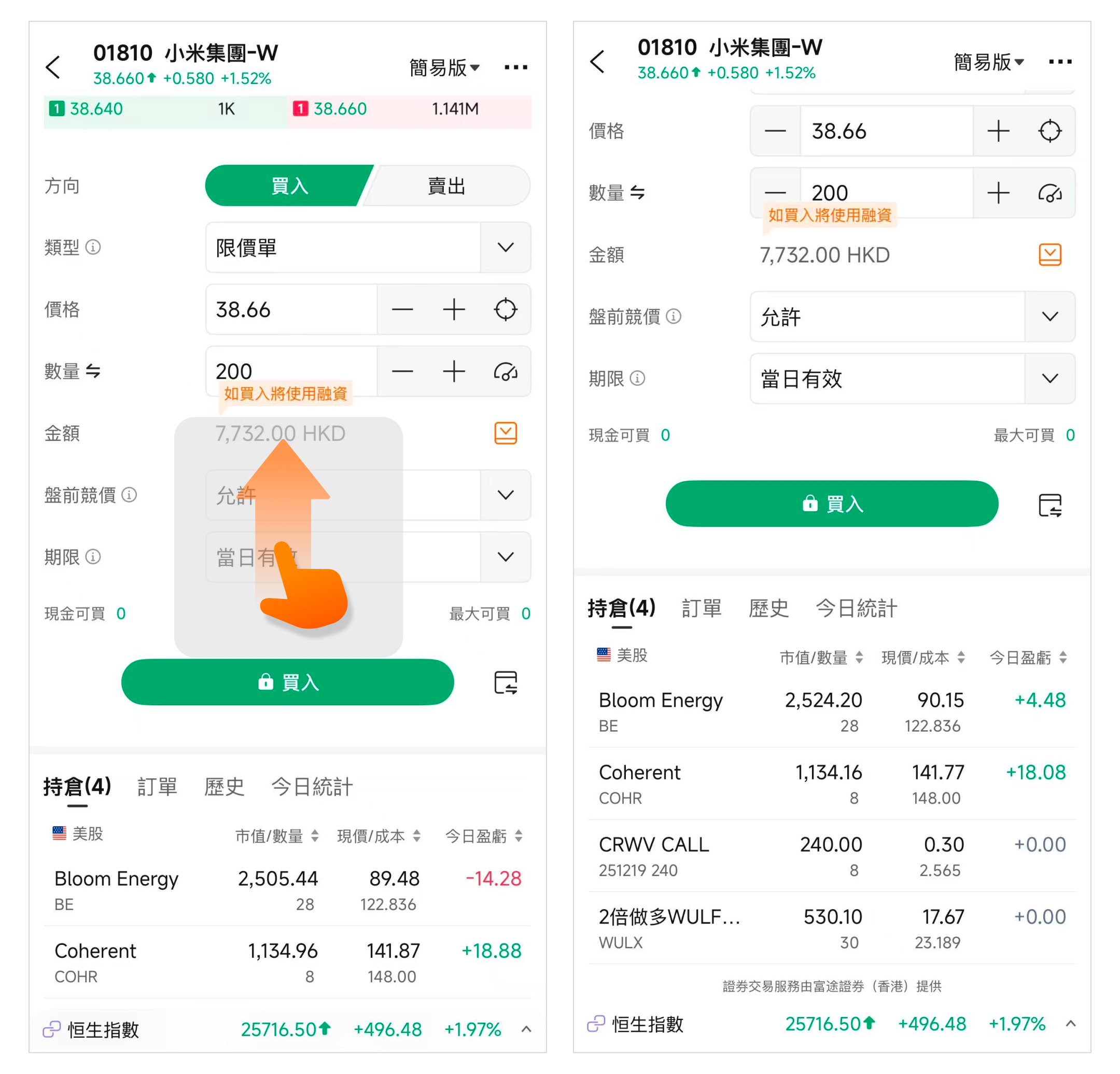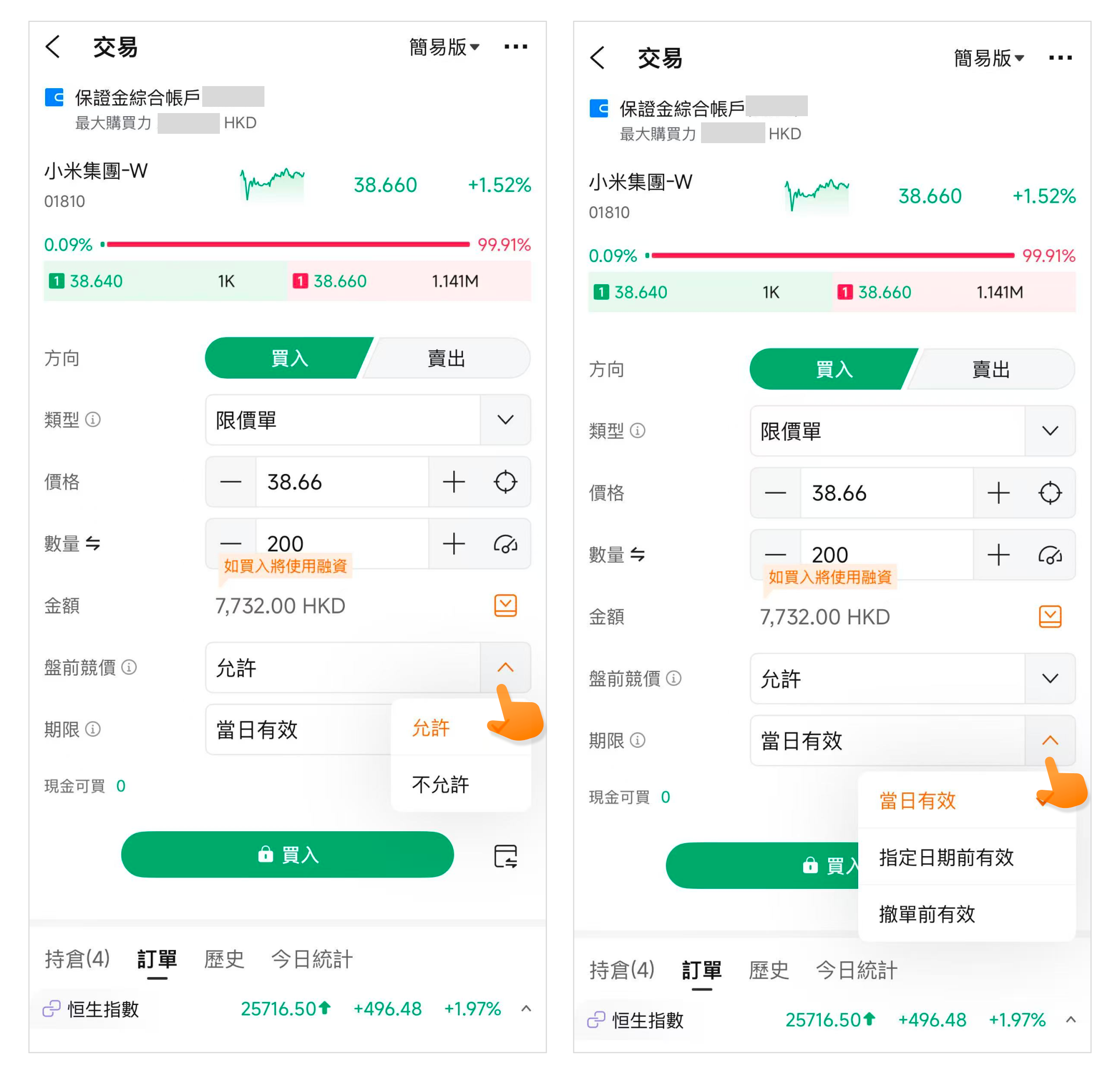 在輸入交易價格和數量後,下方的金額將會根據你的交易參數自動計算生成具體數值,您可點選金額欄旁的按鈕來詳細設置是否允許盤前競價和設置訂單期限。