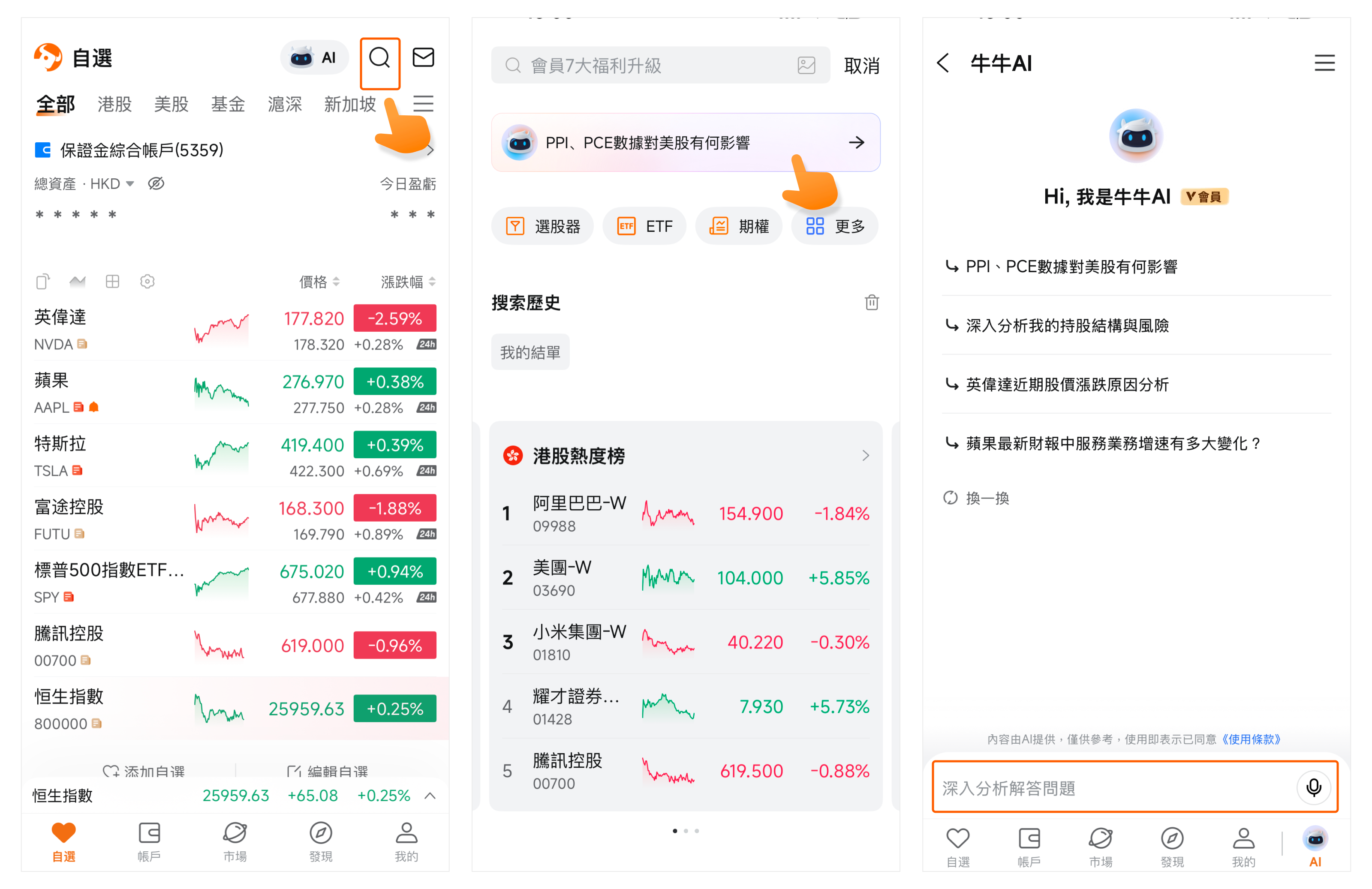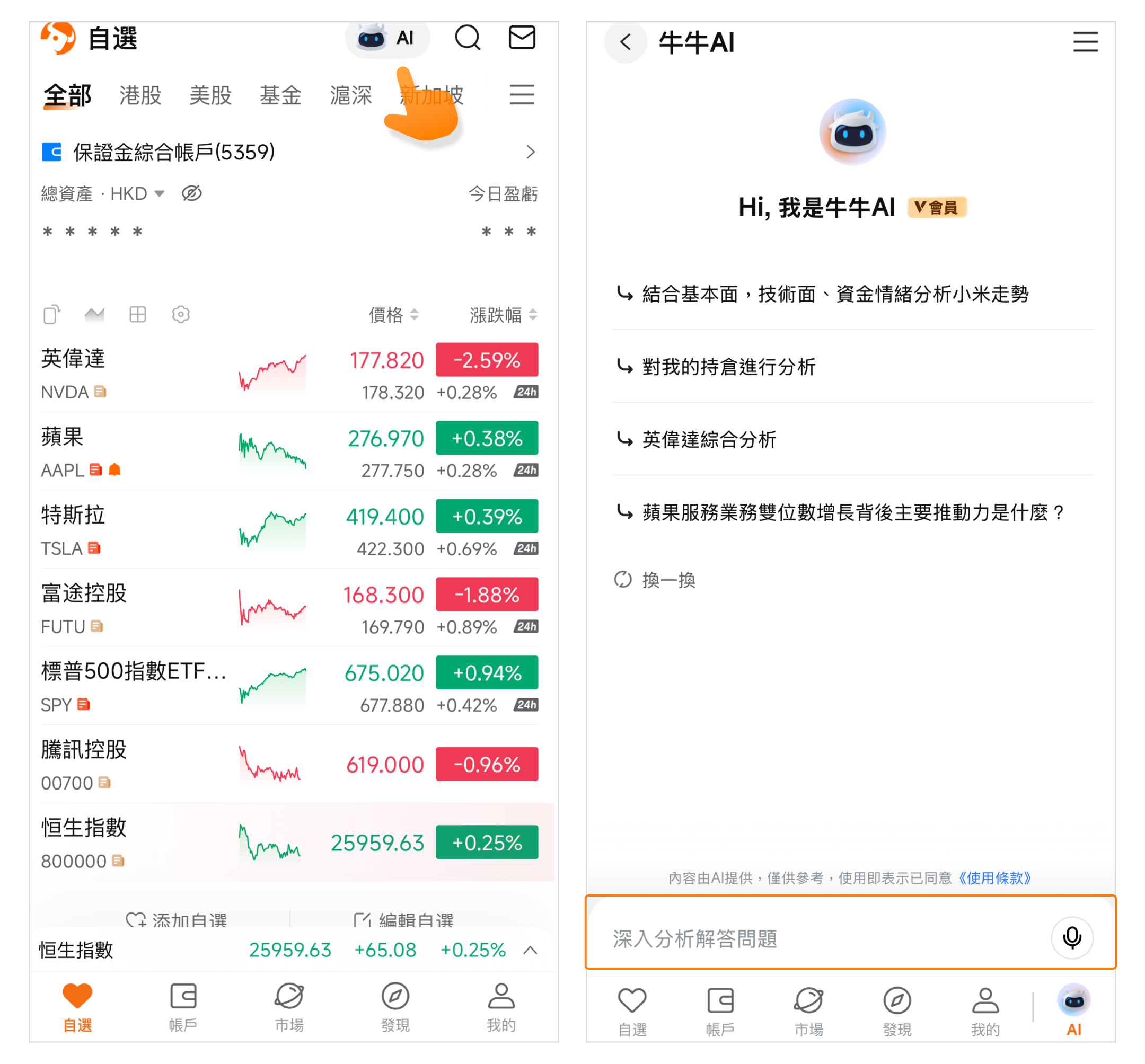 路徑1:自選頁 或 股票報價頁>牛牛AI>開啟牛牛AI對話