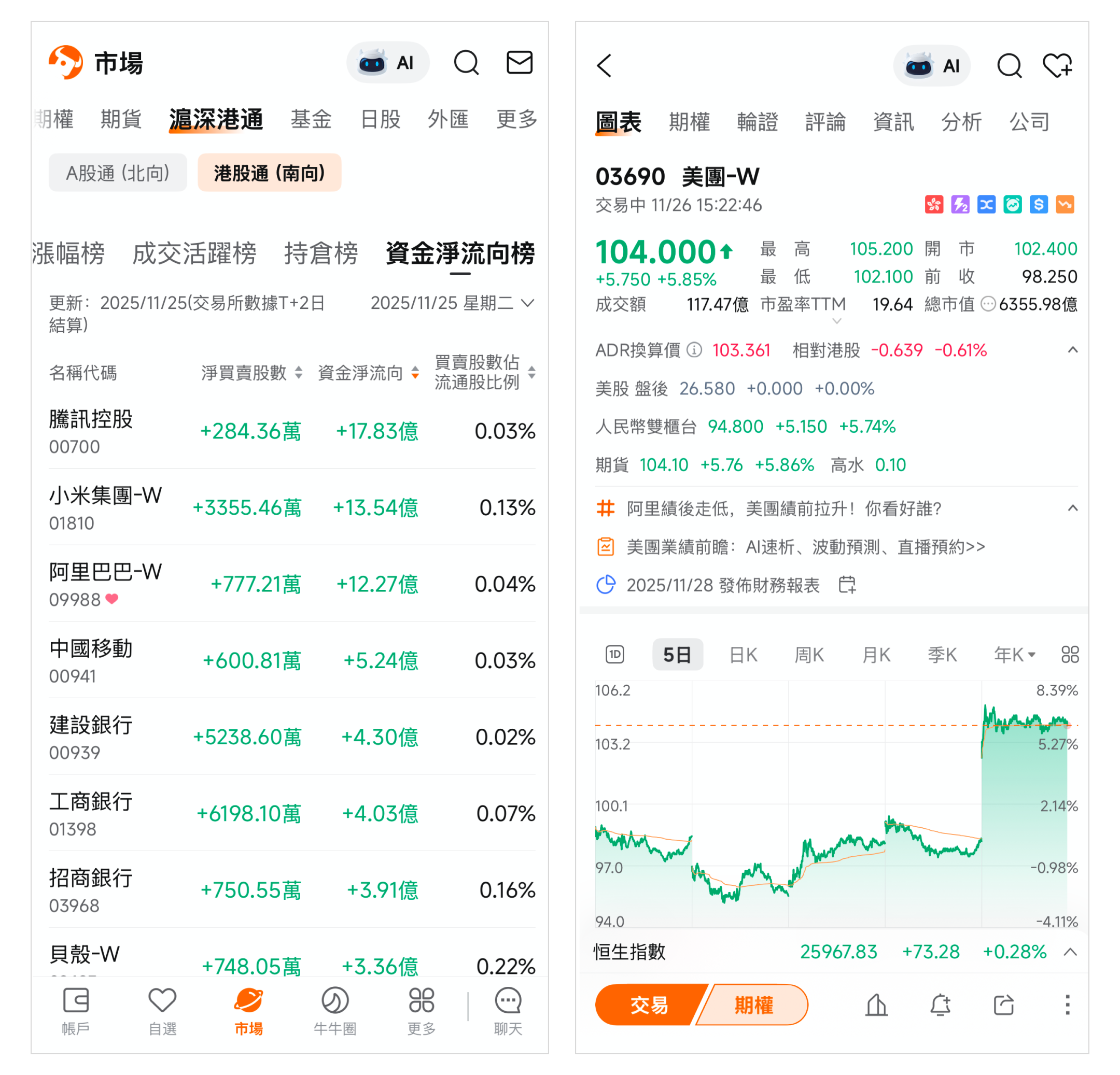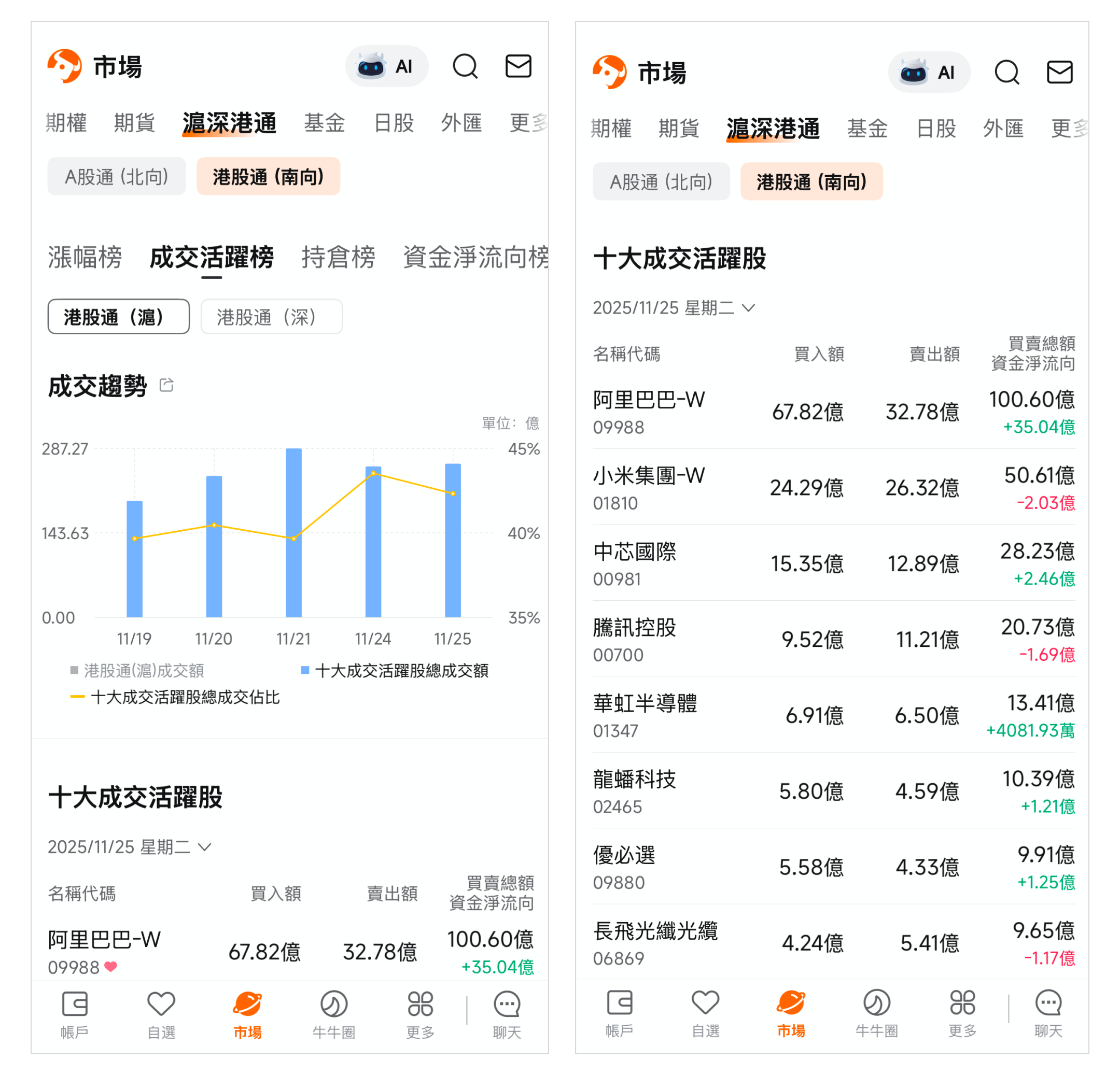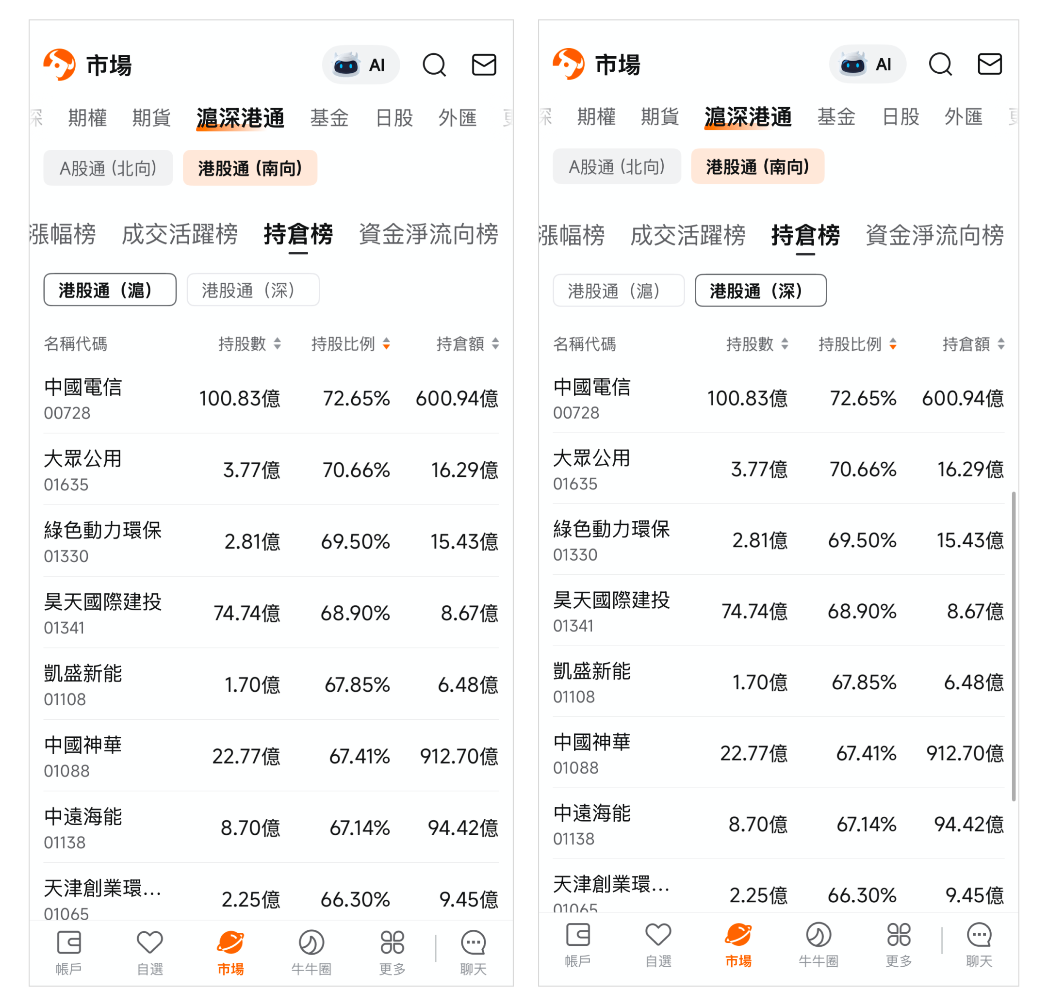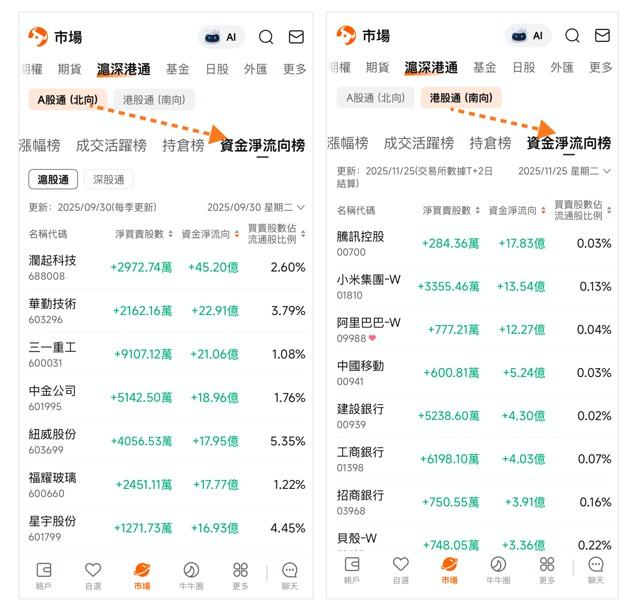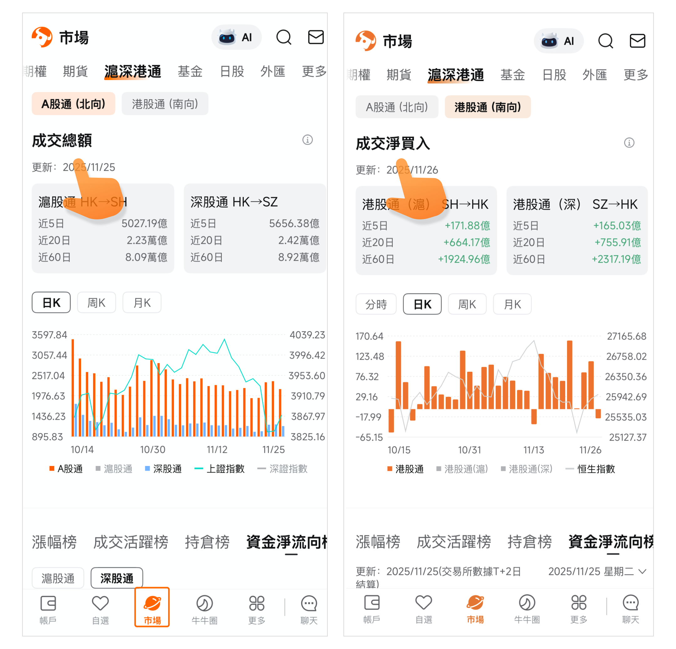 路徑:市場頁>頂部菜單欄>滬深港通。
