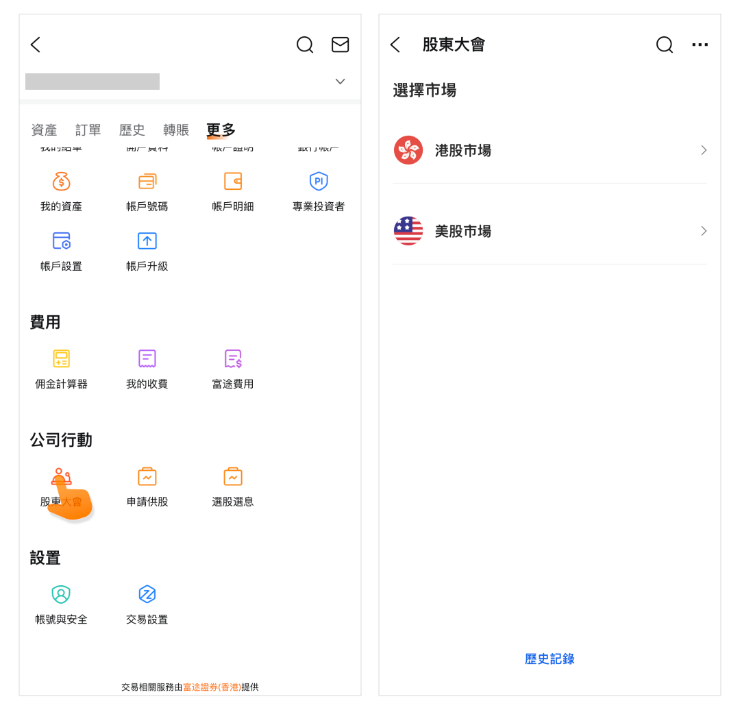 點選「股東大會」,並選擇「港股市場」或「美股市場」,在相應市場界面處將能了解到您可以參加的股東大會。