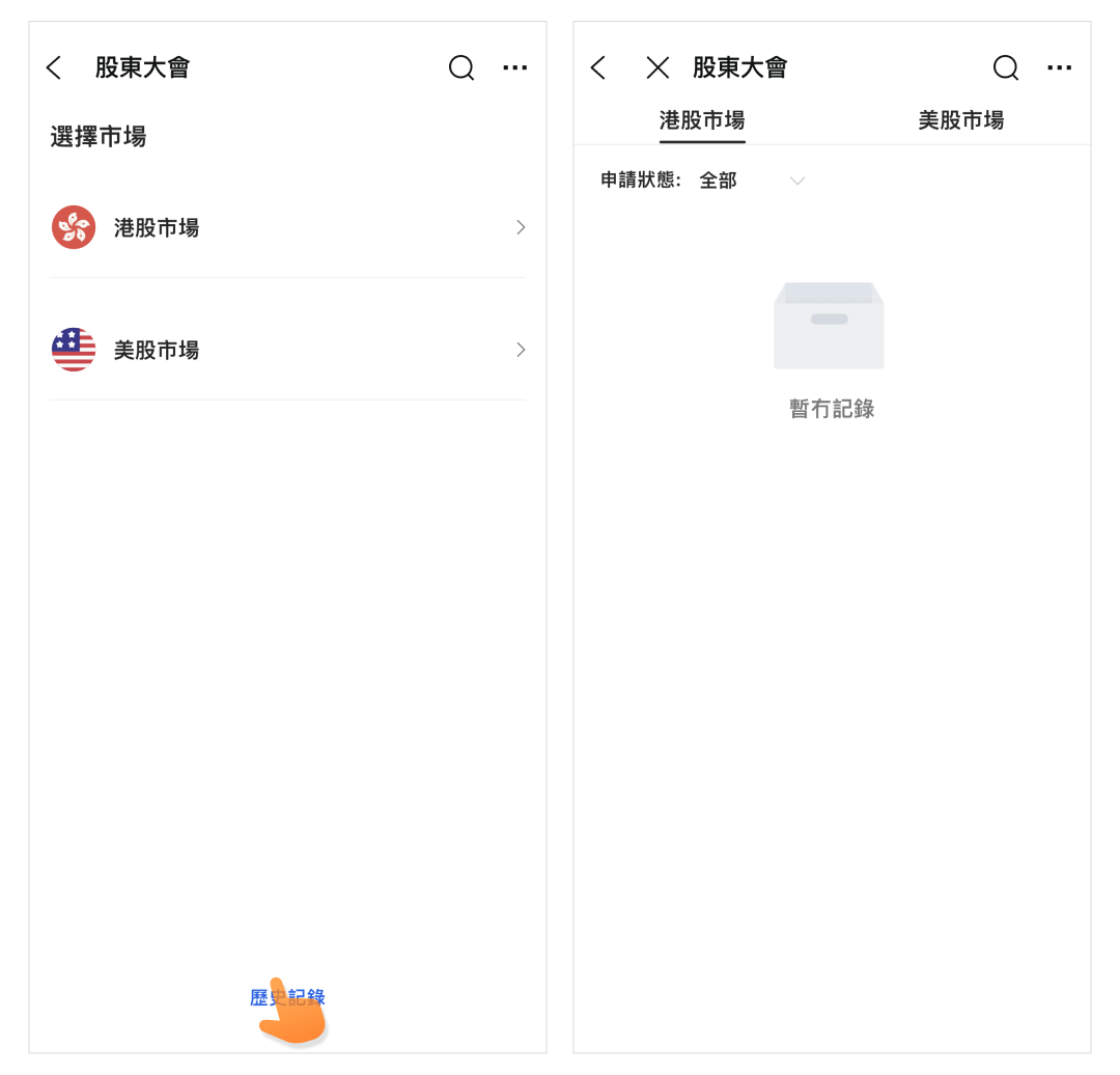 在「選擇市場」頁面的底部還有歷史記錄供你查閱,您可在此頁面快速查看歷史股東大會的相關狀態。