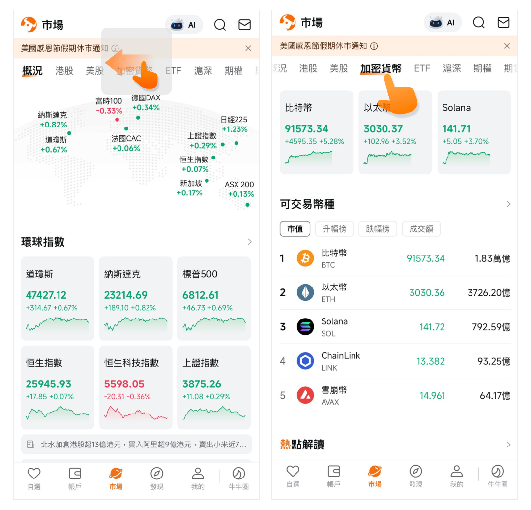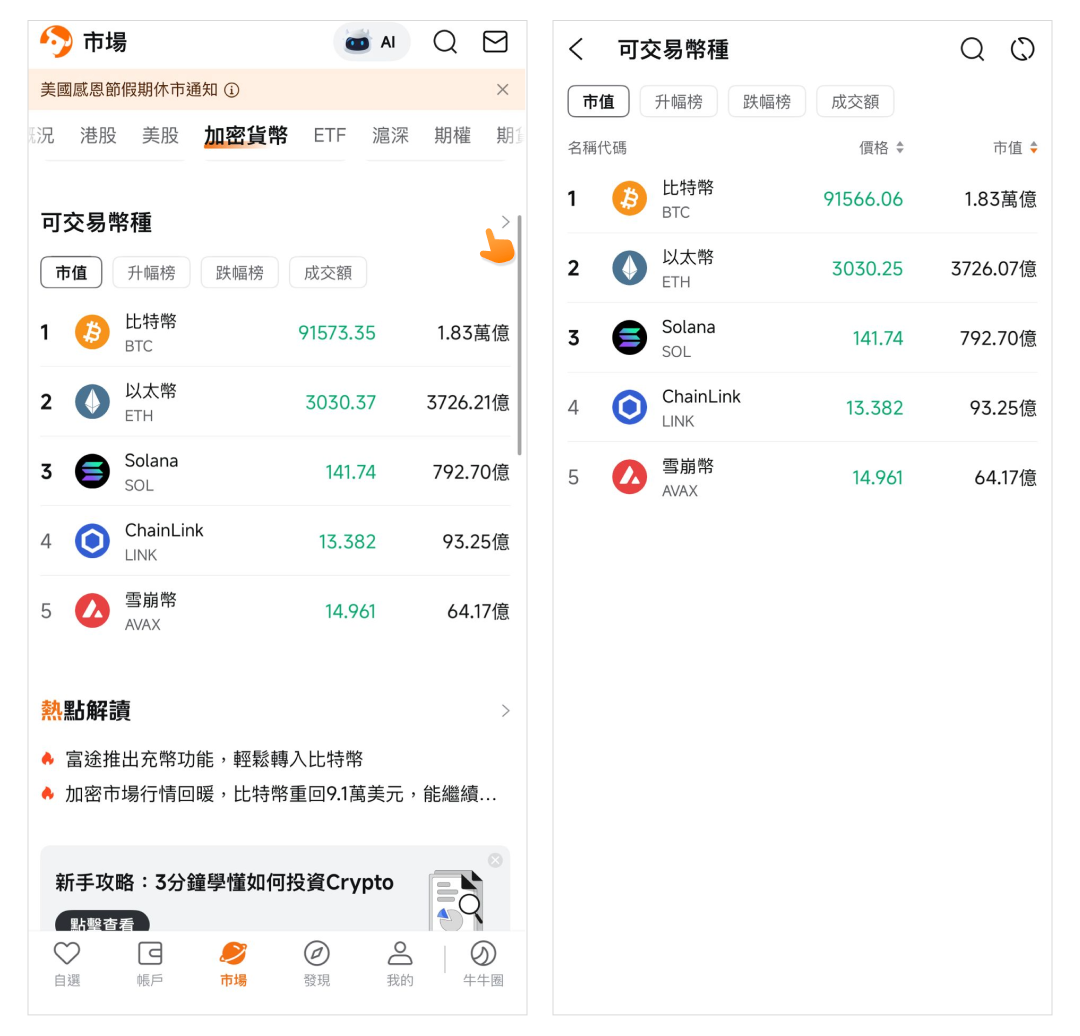 路徑:市場頁>顶部菜單栏>加密貨幣。