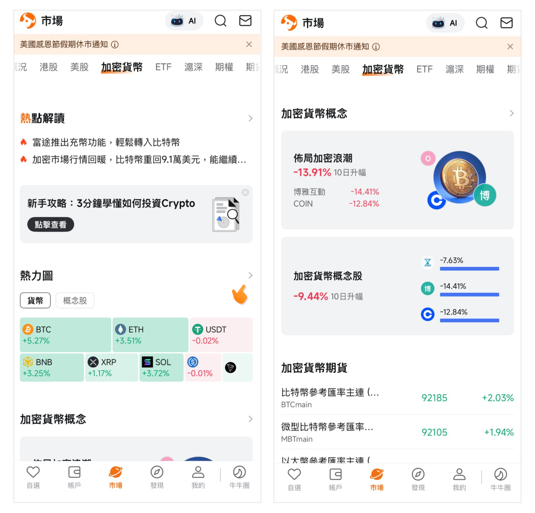 路徑:市場頁>顶部菜單栏>加密貨幣>加密貨幣概念股/加密貨幣期貨/加密貨幣課堂。